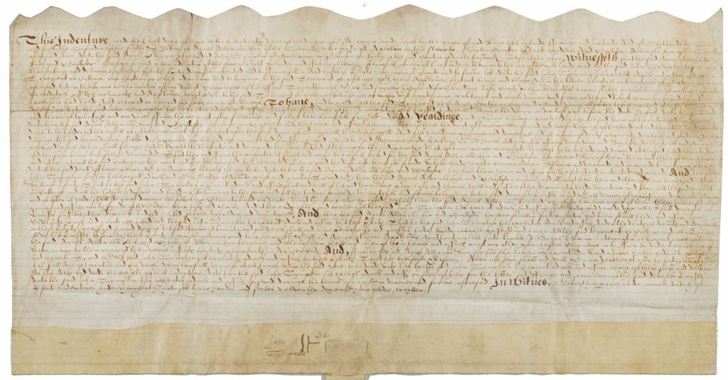 Title deeds and associated documents relating to land and property are an important feature of estate and family archives. With related papers often tied together in bundles, the types of title deeds we might find come in various forms depending on whether the land or property is freehold, leasehold, copyhold, mortgaged or a settlement (with entails). Associated documents include items such as wills, bonds, affidavits and articles of agreement. Being legal documents, title deeds are formally written, and are often in Latin if dated before 1733. They each contain the signatures, or marks, and seals of the parties involved.