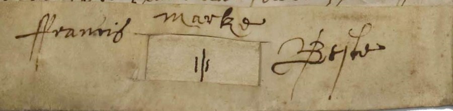One of the most intriguing cases in the Scarborough borough court papers, however, is the witchcraft accusation of Anne Hunnam (alias Marchant) in 1652. Bailiff Luke Robinson records the statements of various witnesses to Anne’s crime and to the finding of witch-marks upon her person, as well as Anne’s own firm statement of her innocence (not signed). The pages below show the signature marks of two witnesses, Margery Fish and Elizabeth Dale, which appear to be stylized initials of their first names.