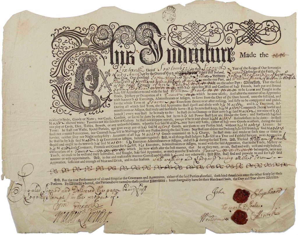 Z.1506 9/1/3 Apprenticeship indenture of John Shepherd, 1703, including detail showing William Frank’s mark