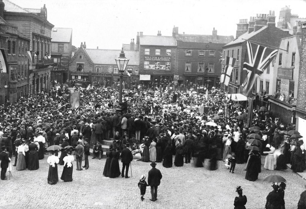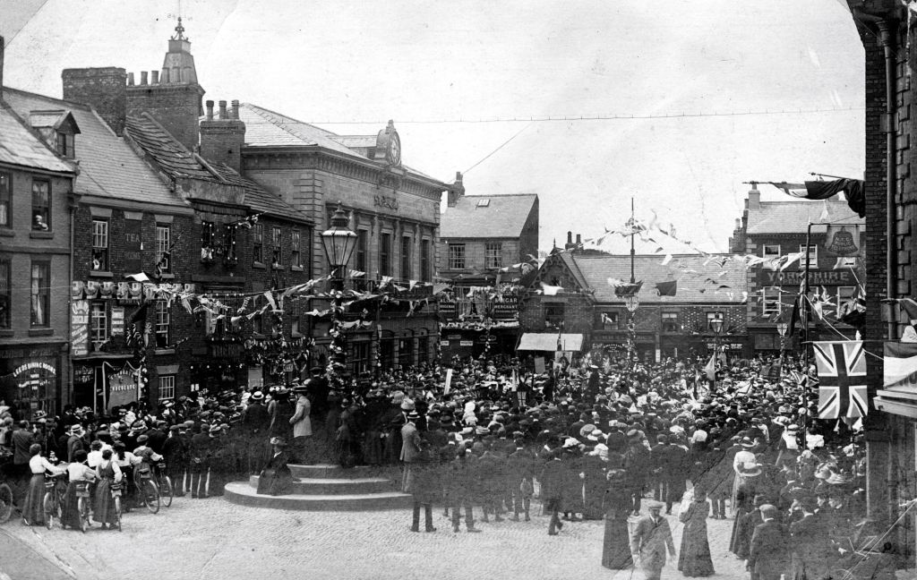 Outdoor festivities marked the coronation of George V, who reigned from 1910 to 1936. The photograph below shows huge crowds gathered in bunting-bedecked Knaresborough Market Place.