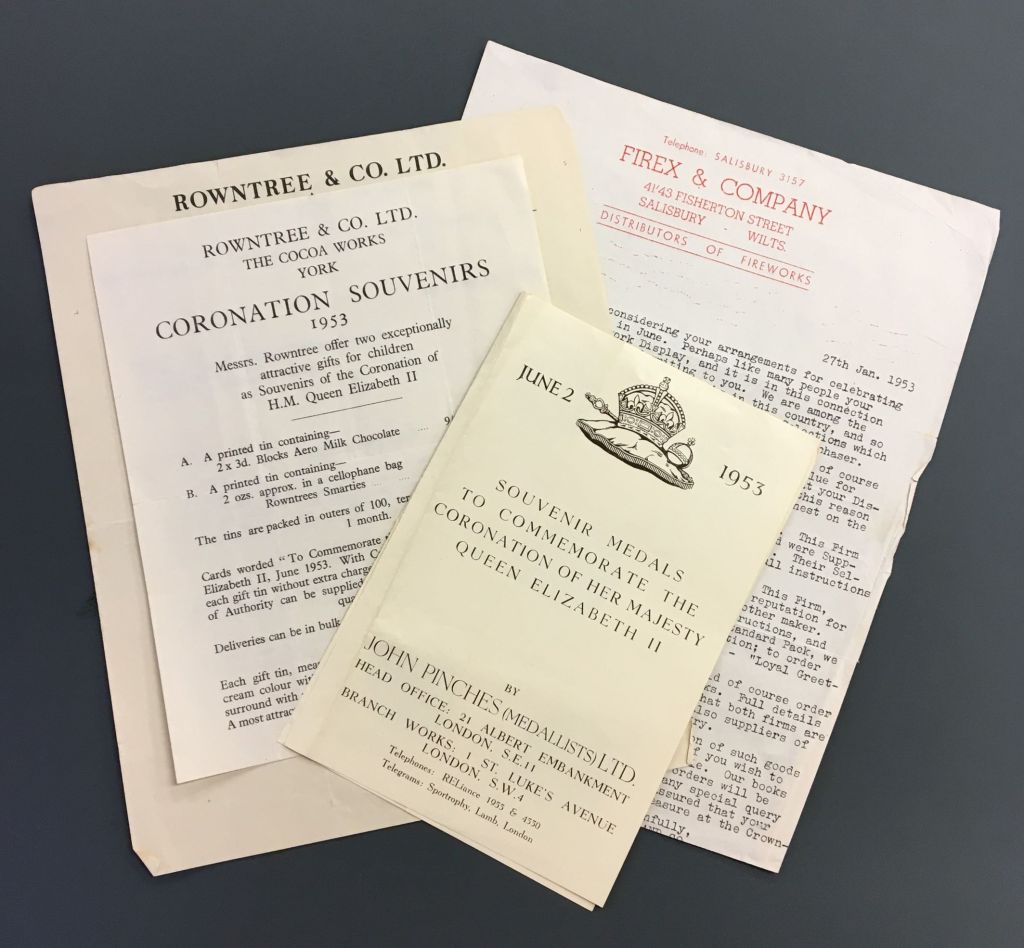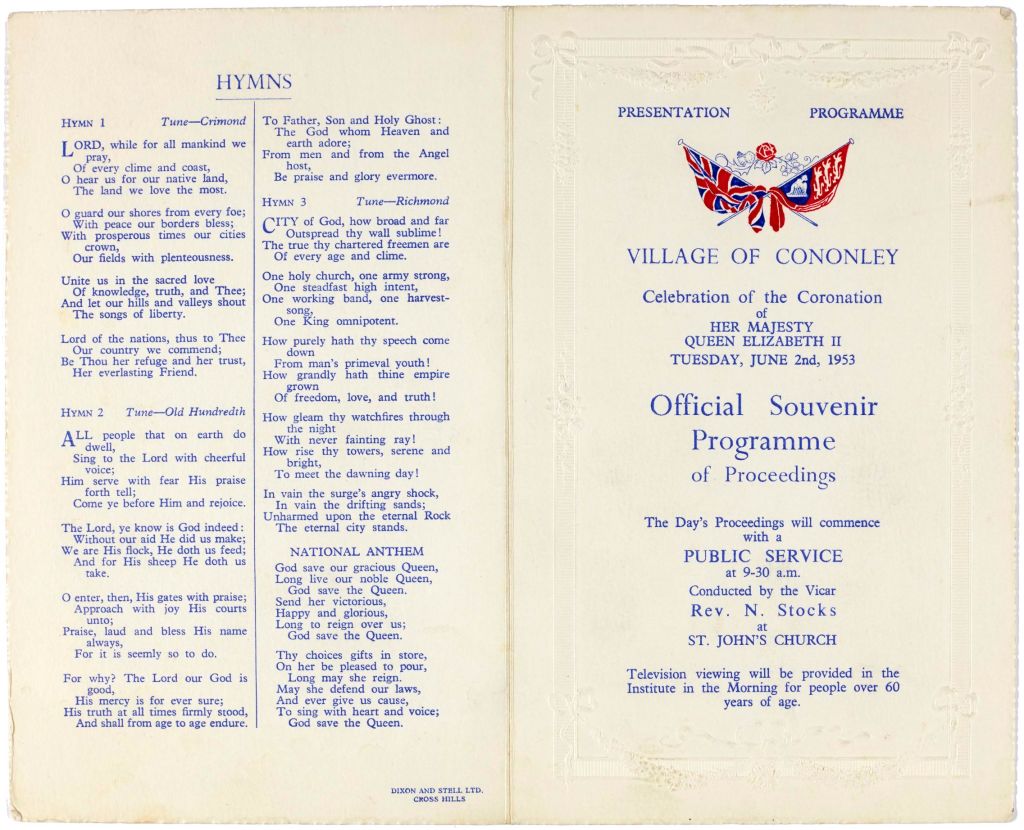 PR/CNN 11/3 Bradley souvenir coronation programme; PC/CNN 8/2/3 Cononley souvenir coronation programme; PC/CNN 8/2/3 Adverts & brochures for Queen Elizabeth II Coronation souvenir items and displays
