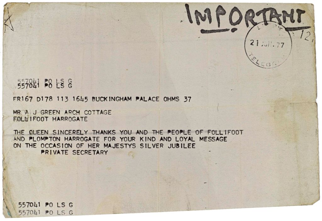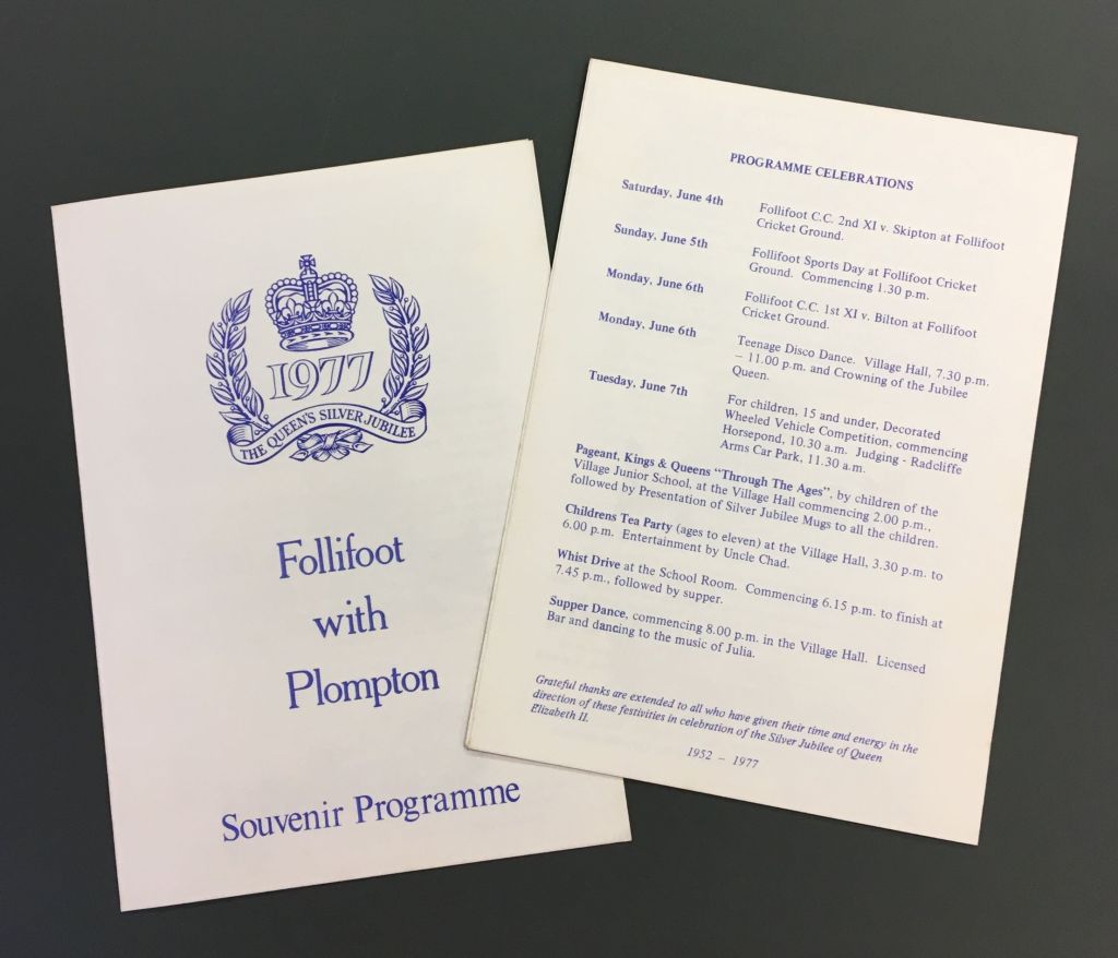 PC/CAT 13/2 Catterick village festivities; PC/FOL 5/9 Telegram from the Queen to the people of Follifoot & Plompton; PC/FOL 5/9/1 Souvenir Silver Jubilee programme; PC/FOL 5/9 Dances, a grand auction, jumble sale and competitions entertained the people of Follifoot & Plompton in 1977