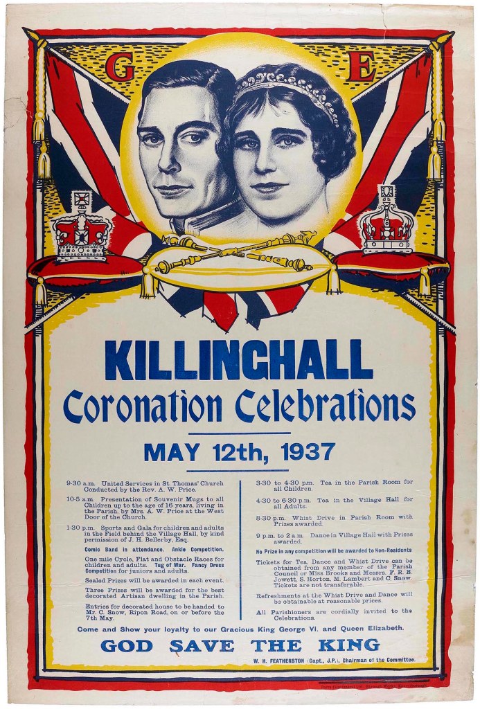 The relatively short reign of Elizabeth’s father, George VI, began in December 1936 until his death in 1952. The wonderful poster below documents the coronation celebrations at Killinghall, near Harrogate, in May 1937.