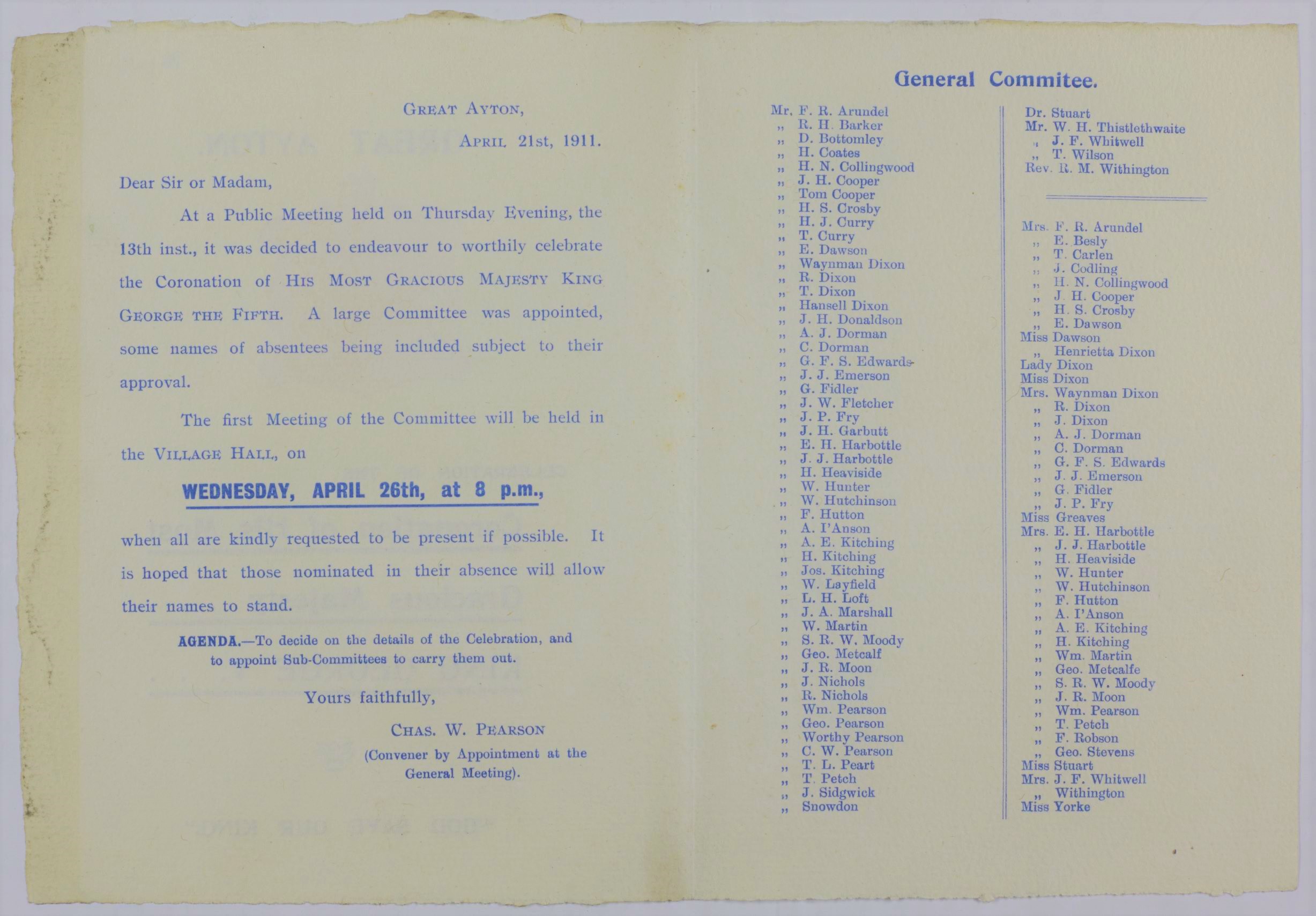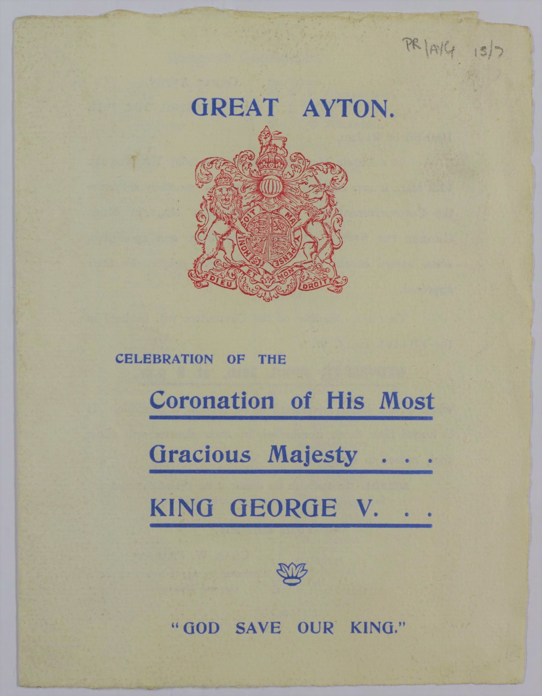 Like many people across the country, the parishioners of Great Ayton organised themselves and formed a large committee to plan village celebrations commemorating the coronation of George V. A souvenir booklet listing committee members is part of Great Ayton parish record collection.
