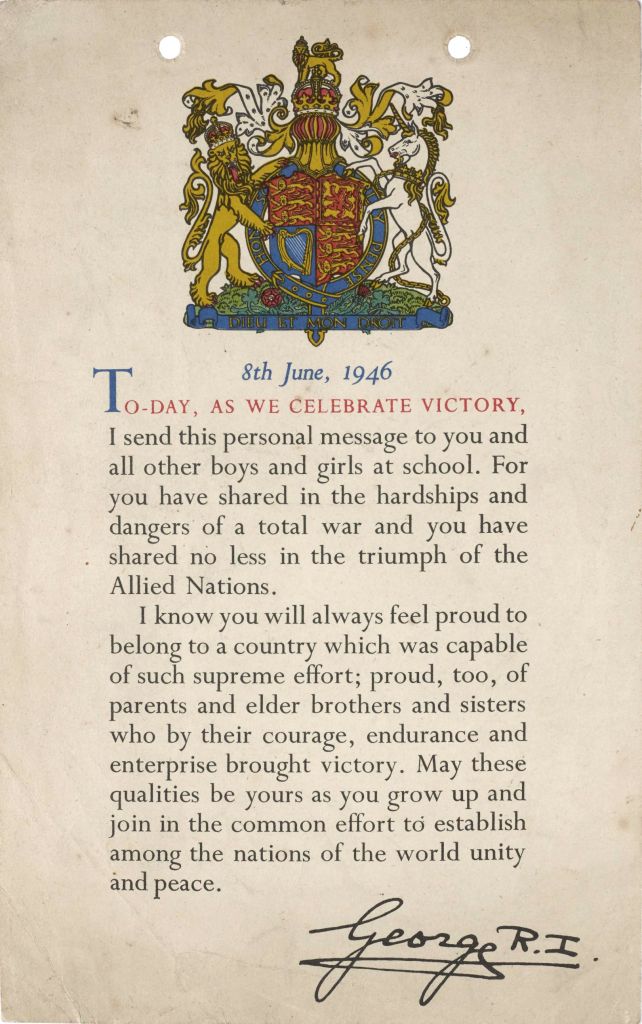 Z.1660 WWII Victory message from George VI to schoolchildren (1946) Folio & verso