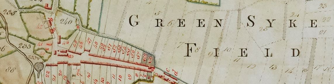 The earliest surviving plan of the township of Harome dates to 1782 [ZEW(M)8a, see below]. The key to this plan notes that “The open fields are colour’d round within”. These fields are centrally located close to the village, named ‘Hall Garth Field’, ‘Green Syke Field’, ‘Owman Field’ and ‘Heads Field’ to the north, suggesting that a four-field system of crop rotation may have been in operation at this time. Within these fields, individual strips are coloured and numbered, indicating the holdings of particular landowners dispersed across several fields in a variety of different furlongs. In addition, there are linear closes to the rear of each of the village properties perpendicular to the main street to the north and south. These would have been enclosed for gardens and grazing of animals.