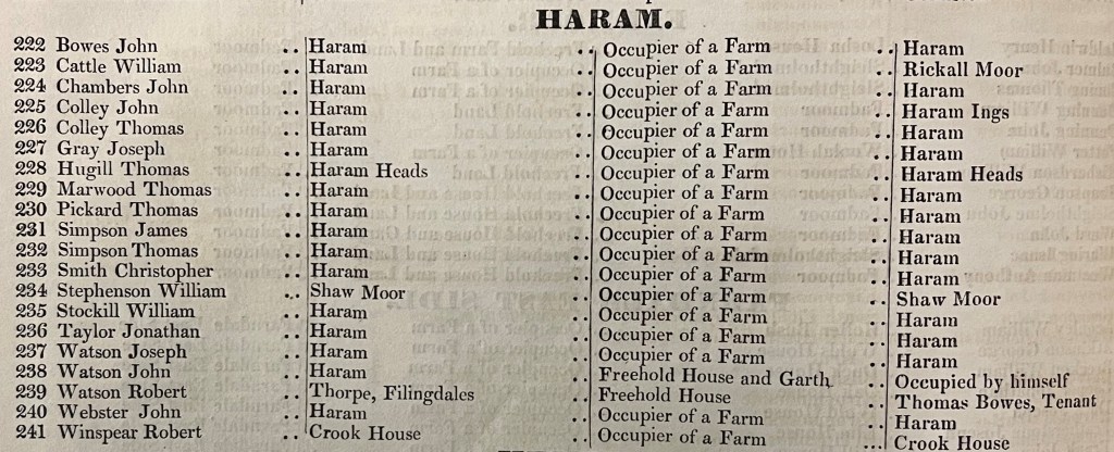 The earliest Register of Electors for the North Riding of 1832 lists eighteen men whose nature of qualification to vote is cited as ‘occupier of a farm’ in Haram [QDE(R)]. Whilst most of these farms are unspecified, Rickall Moor, Haram Ings, Haram Heads, Shaw Moor and Crook House are identified by name.