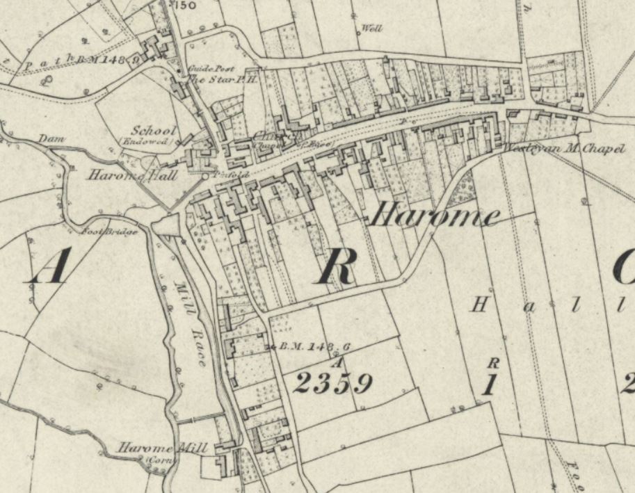 The village of Harome is first mentioned in Domesday Book in AD 1086 and lies central to the township on a main street aligned east to west (Page ed 1914). There is also a north-south axis of properties at the western end parallel to Riccal Beck, an offshoot from which forms the mill race and pond associated with a water mill dating from the 13th century (NYHER MNY 24939).