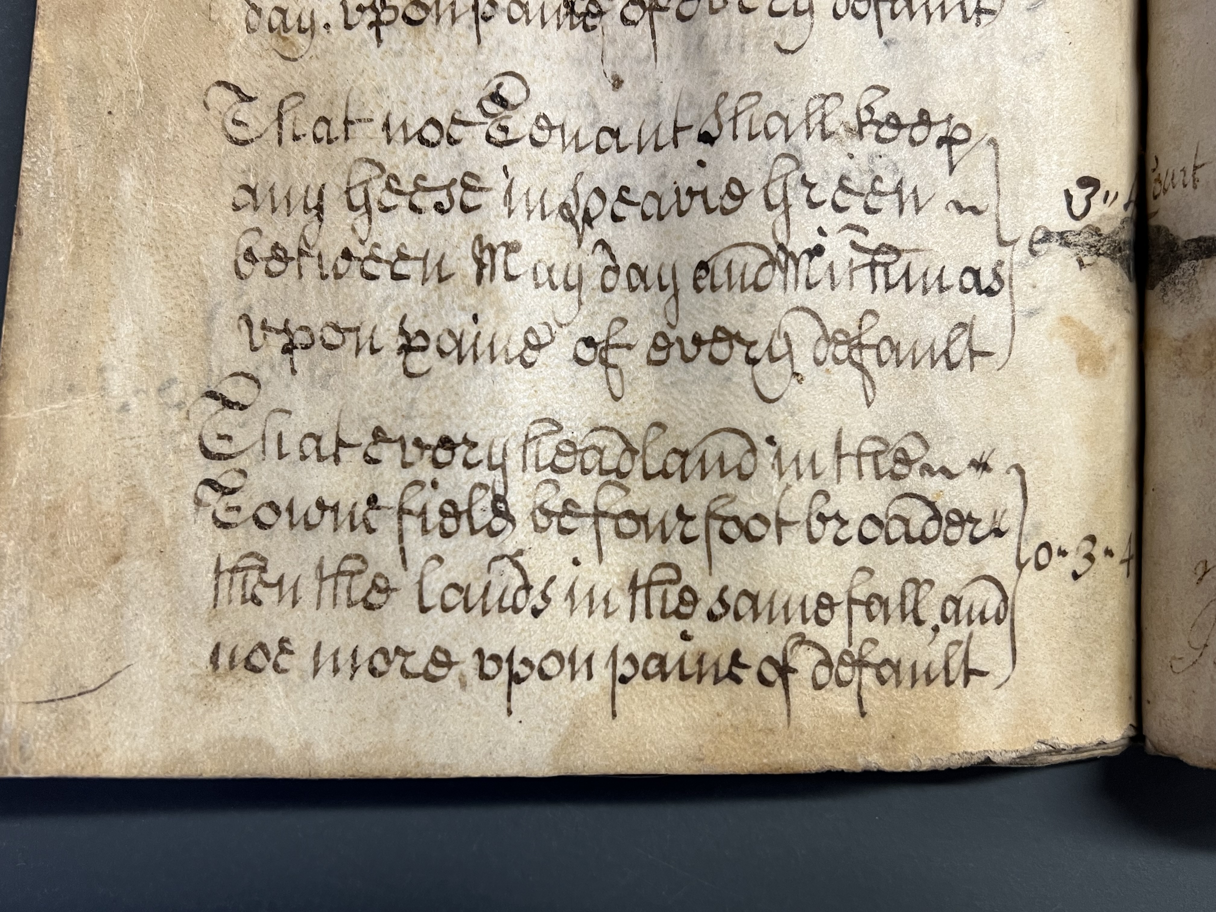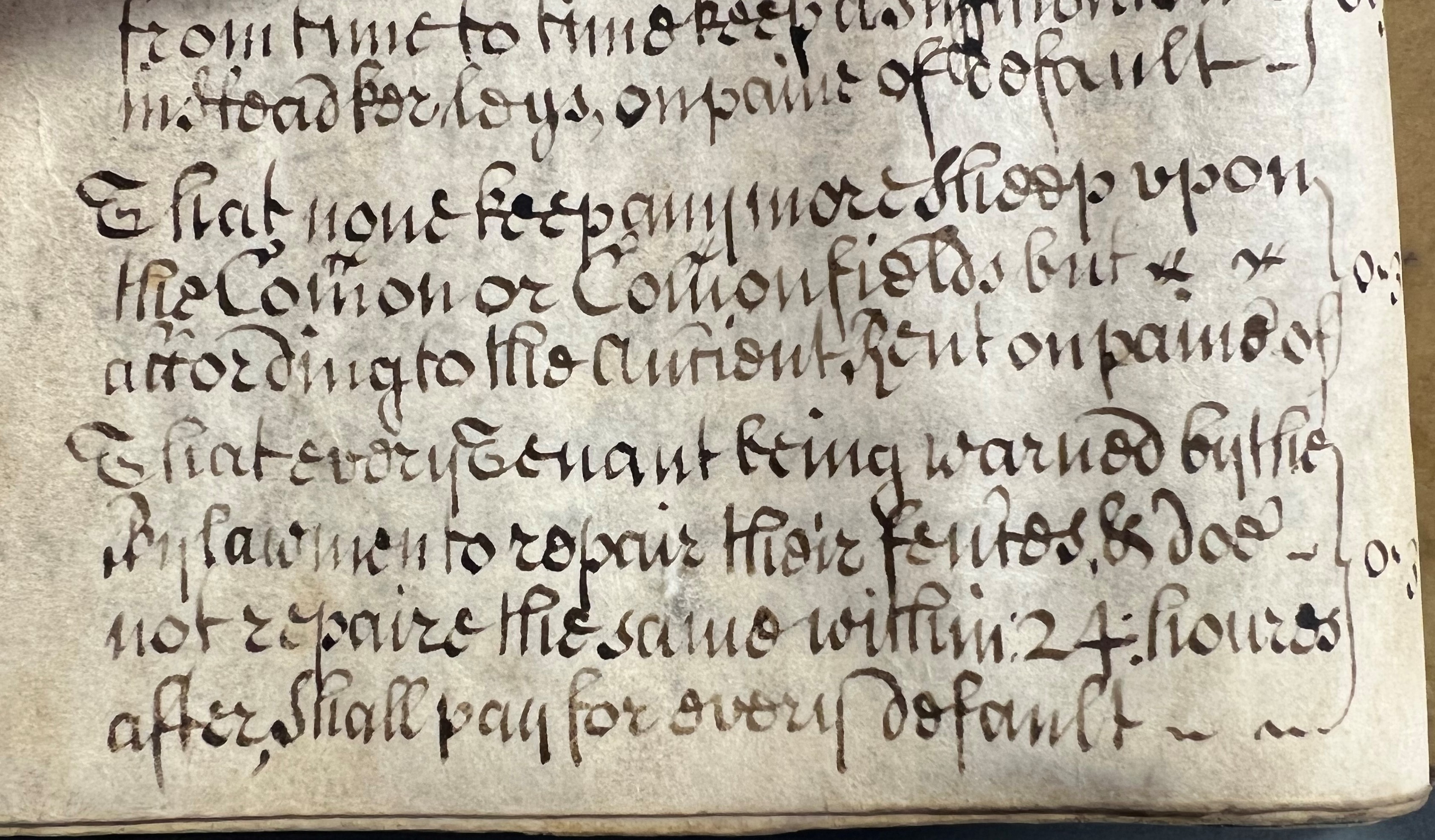 The book contains reference to the Townefield, the common and fallow fields: “That every headland in the Townefield be four foot broader than the lands in the same fall, and noe more on paine of default” and “all Rams, Tups, Ridglins be taken in of the common and fallow fields on the 18 day of September or before and kept of until the 18 day of October and then may let go all such as the Maijor part of the Jury shall think fit to be put in and all the rest to be kept of until the 25 of December upon pain of every default 3s 4d”.