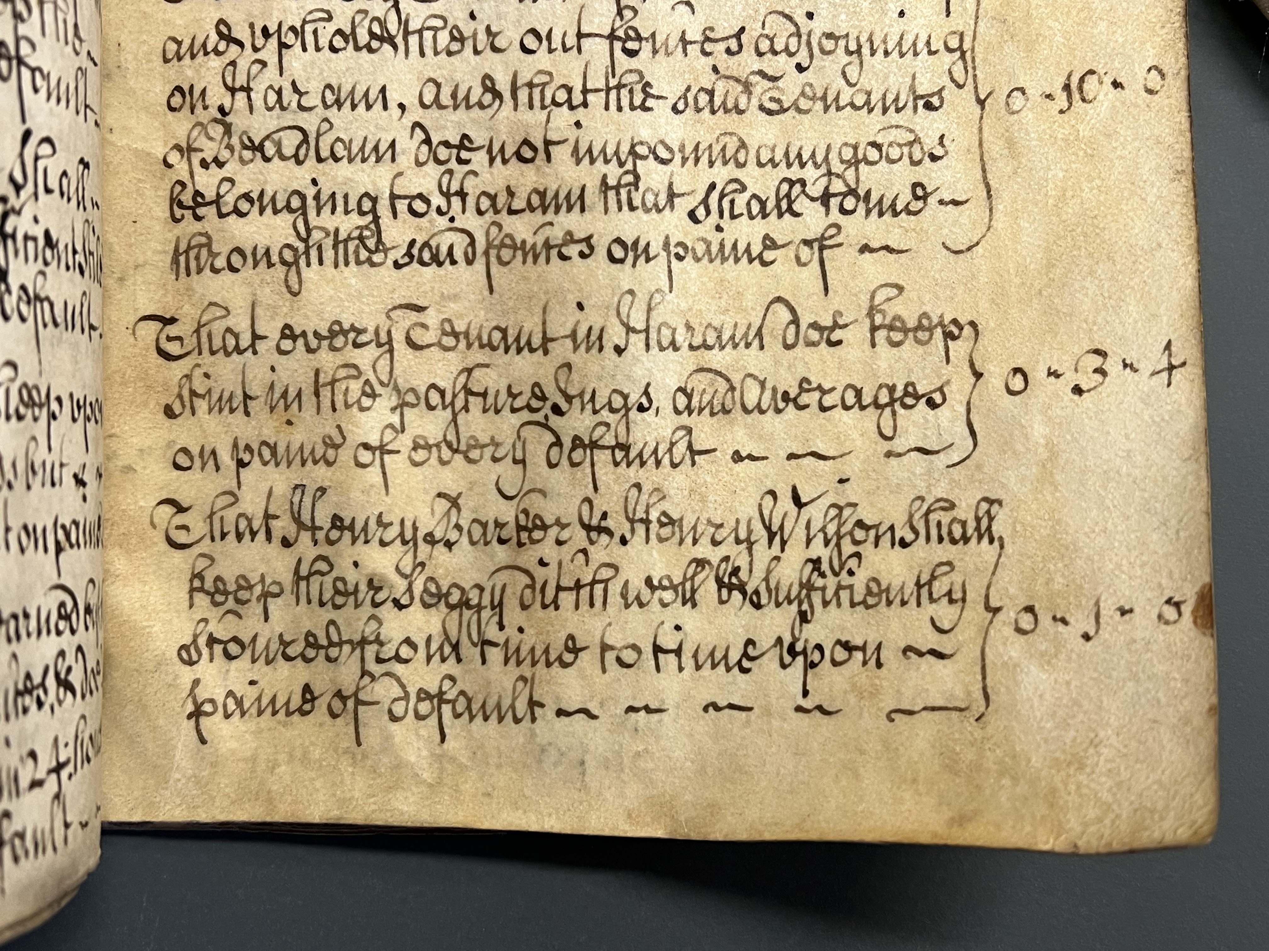 The operation of a communal open field system of agriculture in Harome can be seen in surviving manorial court records, in an 18th-century pains book signed by the Jury of the manor court held on 29 October 1737 [Z.1353]. The ‘pains’ are the rules and regulations of the manor.