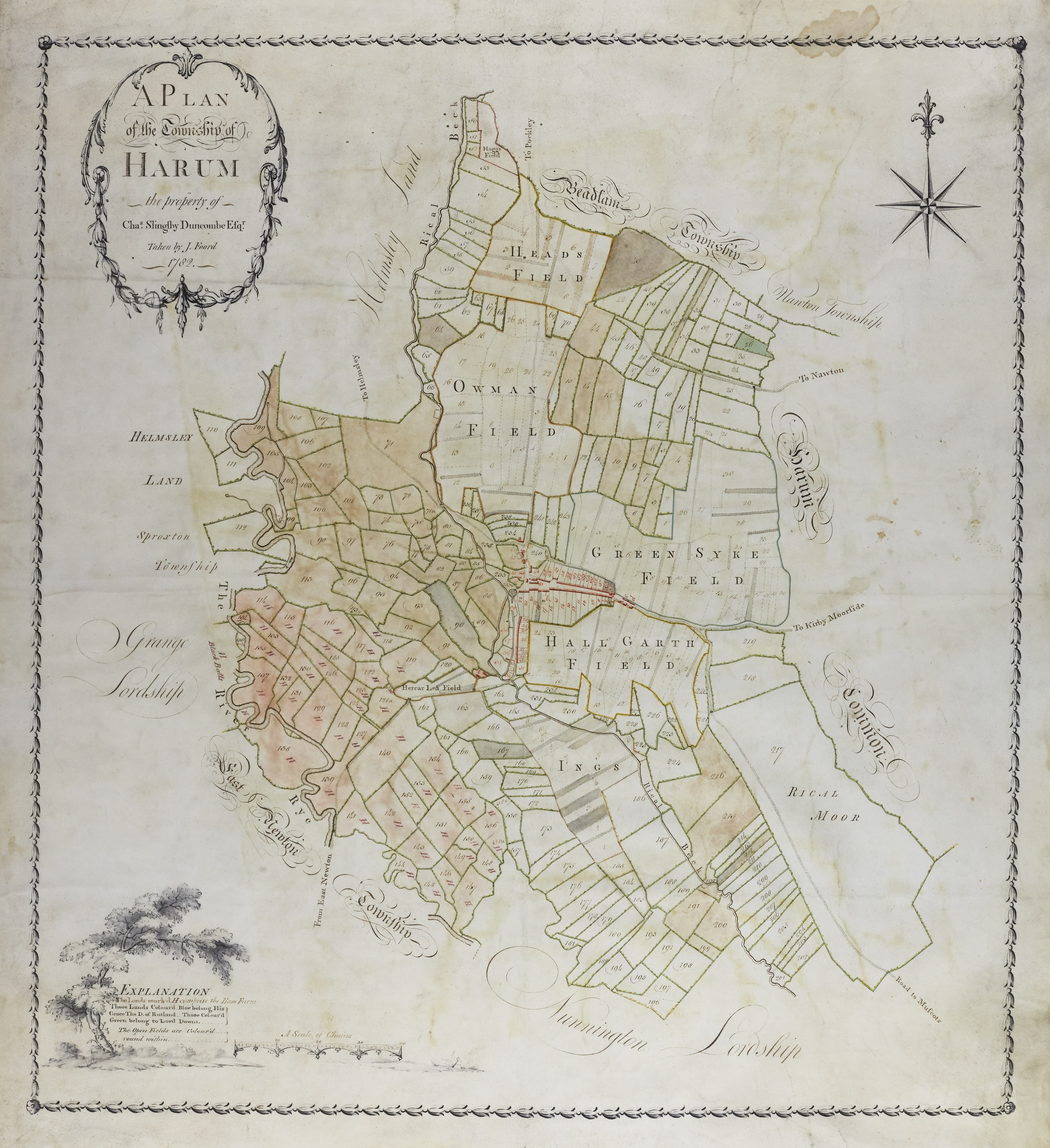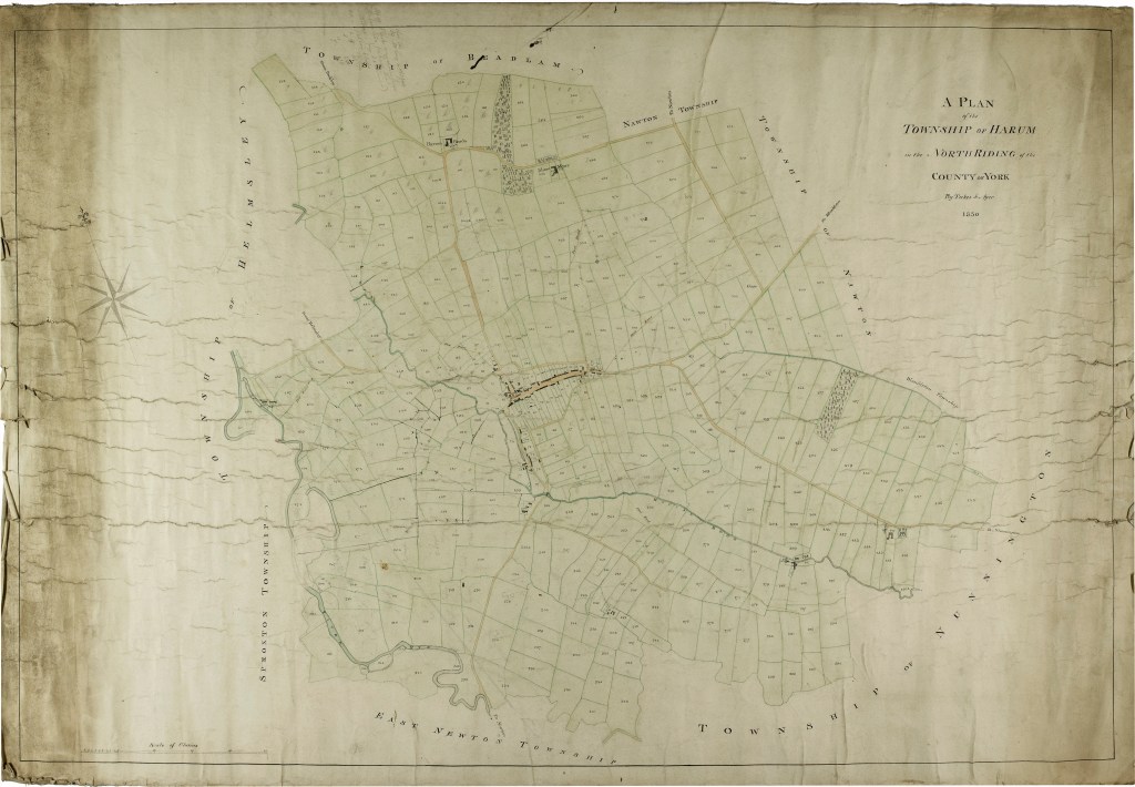 These lands in Harome were acquired in 1695 by Charles Duncombe, who had bought the Helmsley estate from the heirs of the Duke of Buckingham in 1687. This map forms part of Joseph Foord’s survey of the entire 29,000 acre Helmsley estate for Charles Slingsby Duncombe which he began in 1779 [ZEW(M)8a]. Foord took about six years to complete the survey, the eventual bill for which came to £564.