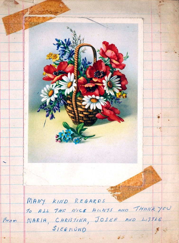 “MANY KIND REGARDS TO ALL THE NICE AUNTS AND THANK YOU FROM MARIA, CHRISTINA, JOSEF AND LITTLE SIEGMUND“