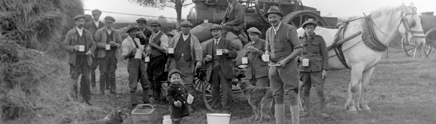 There are many agricultural activities captured in her photographs, such as corn harvesting, potato picking and the hoeing of turnips. There are studies of cattle, sheep, pigs and a gaggle of geese, which belong to the Smiths of High Dunsforth. Among the parishioners, Louisa spent a lot of her time with the Church family at Oakroyd Farm in Lower Dunsforth. She documented every aspect of their harvest, including cutting the hay, scaling, staking and leading. Louisa turned out for the threshing, and even persuaded a group of workers to pose against the background of the steam thresher with their mugs of tea (see image above).