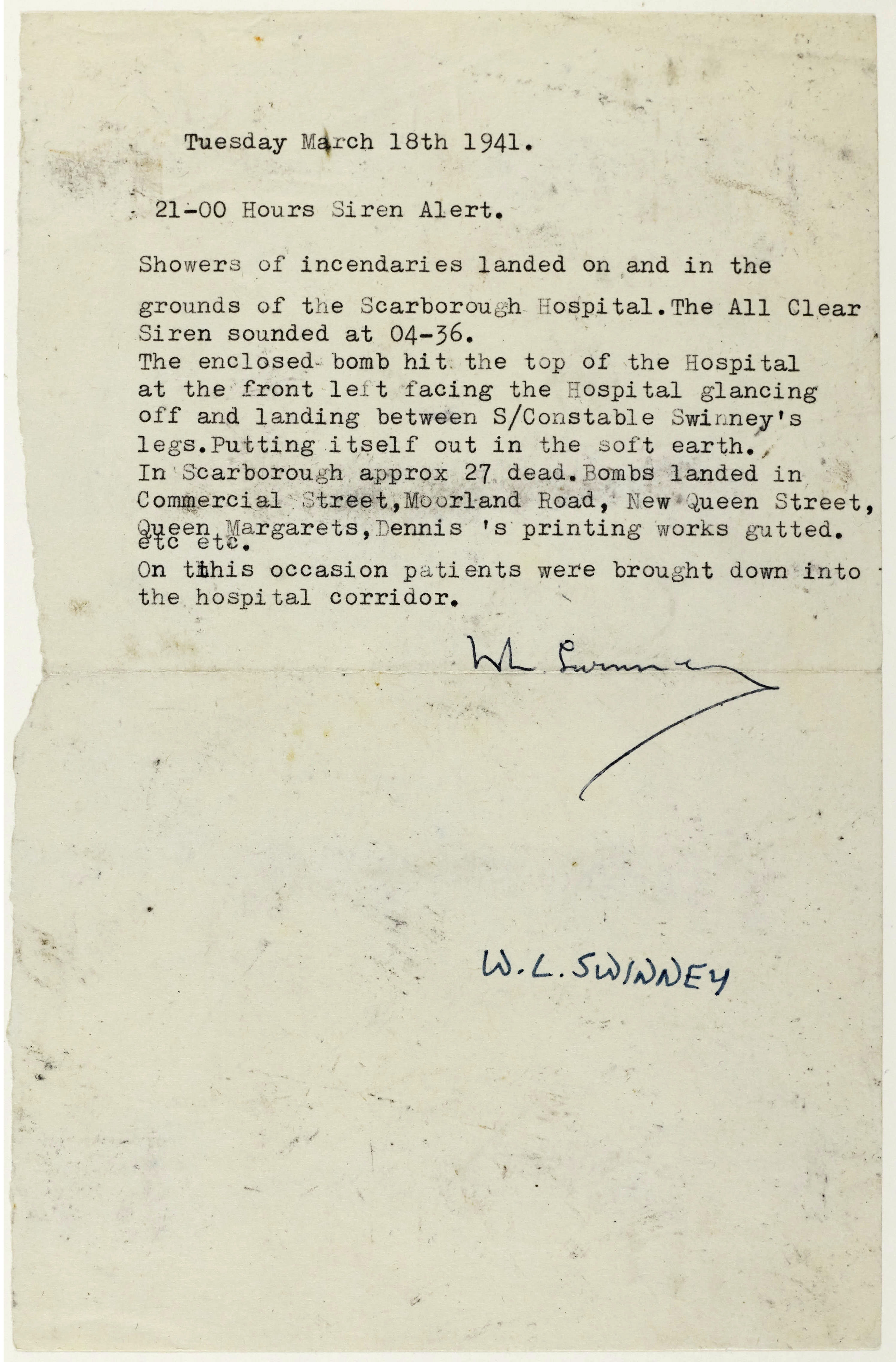 - NHS-HOS-SC 9/6 Note relating to the air raid over Scarborough Hospital and incendiary devices landing on the hospital, written by W L Swinney, Special Constable, 1941.