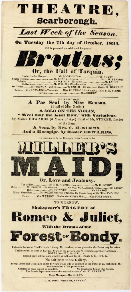 Z.1734 Scarborough Theatre Playbills: (left to right) Brutus, 7 Oct 1834; Romeo and Juliet, 8 Oct 1834 and Othello, 9 Oct 1834