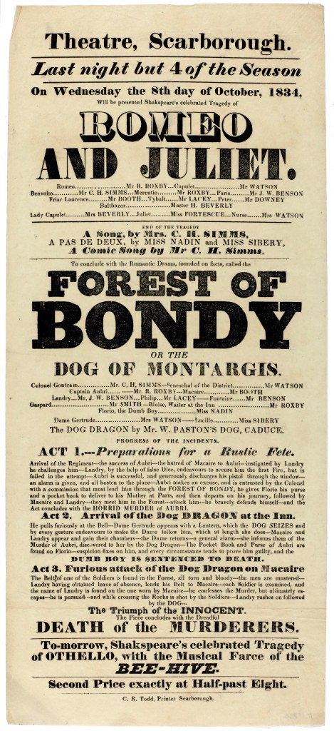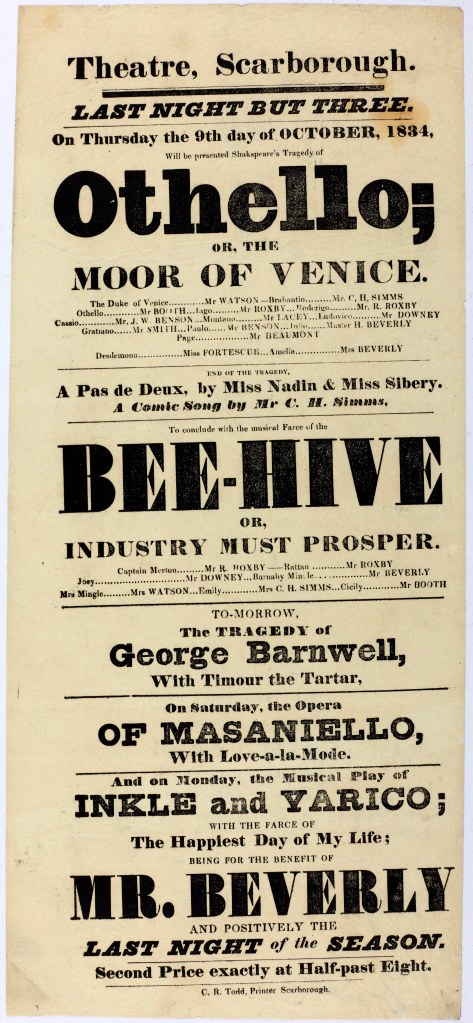 These playbills are for plays at the theatre in Scarborough on three consecutive nights in October 1834. Each evening starts with a tragedy with the same players taking the roles. The third night concludes with a musical farce ‘Bee-Hive’.