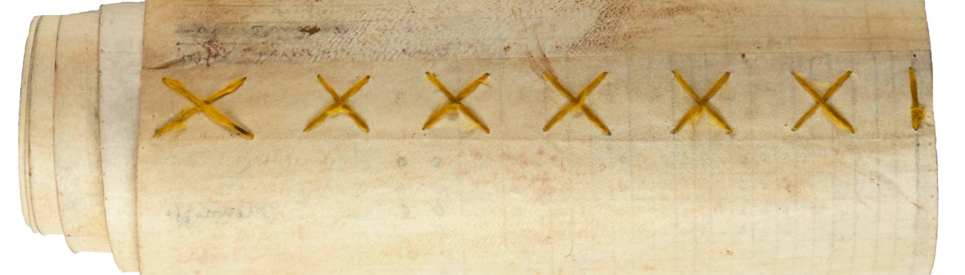 The rental arrived from the auction house rolled round an oak support, but it is not obvious if this is contemporary with the manuscript. The manuscript itself consists of three membranes of parchment, measuring over two metres in length and 25 centimetres in width. The three membranes are sewn together with a distinctive yellow wool. This is an almost identical format to the earlier rental of 1605-1622 already held in the Derwent of Hackness archive.