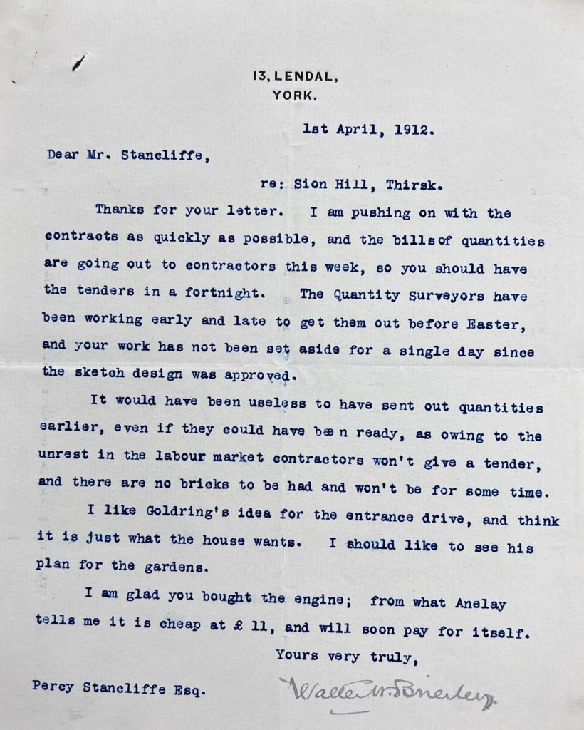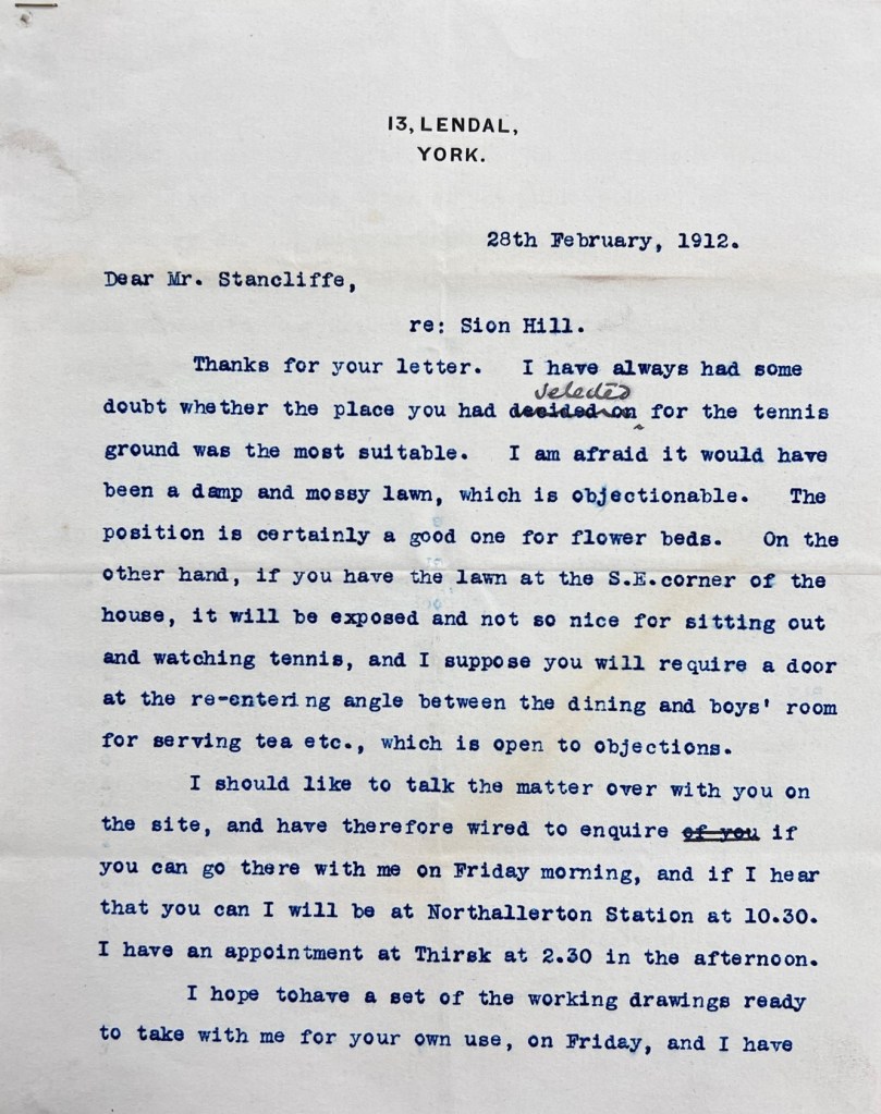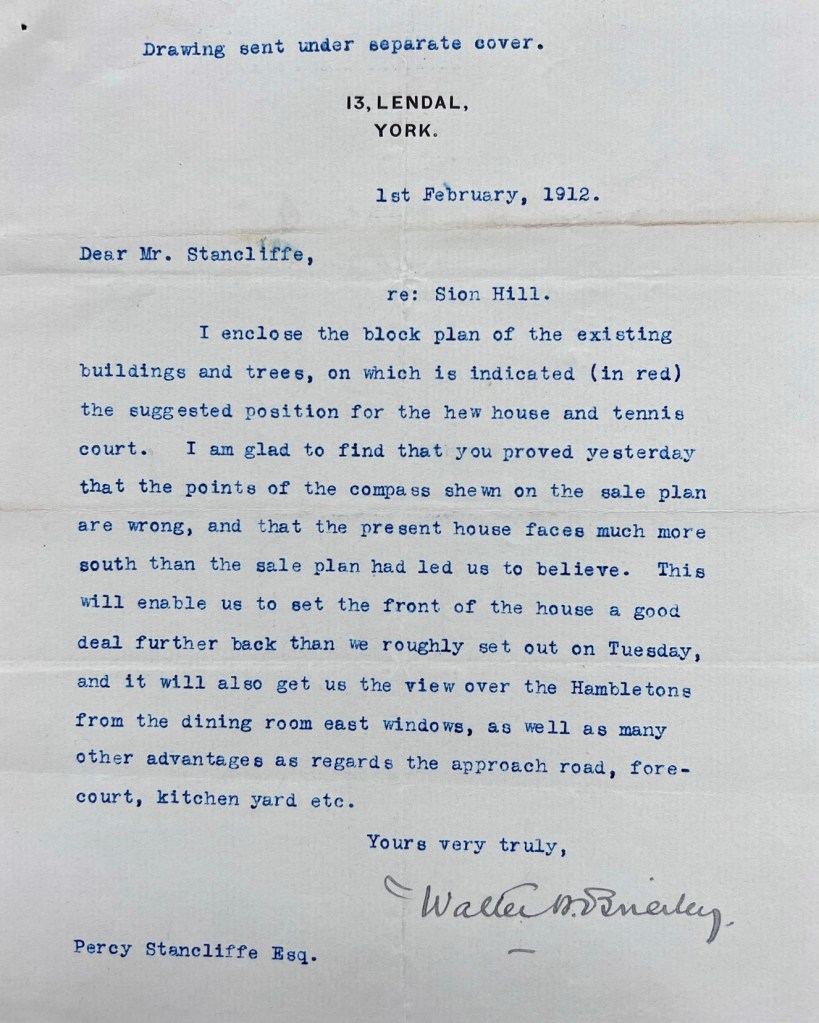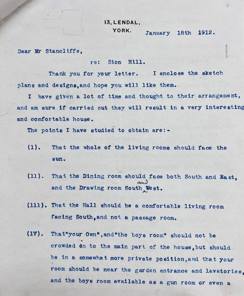Soon after the auction, and before the purchase was completed, Stancliffe took Coverdale’s advice and set in motion a project to build a new house at Sion Hill, approaching architect Walter H. Brierley (1862-1926) of 13 Lendal, York in November 1911. The earliest surviving correspondence from Brierley is dated 18 December 1911, in which he provided an update on his progress drawing up the plans. A month later, on 18 January 1912, the initial designs were sent to Stancliffe, accompanied by a four-page letter from Brierley outlining his approach to the layout and design, and inviting Mr & Mrs Stancliffe to his own house at Bishopbarns in York to see the fittings (see designs and letters pictured below).