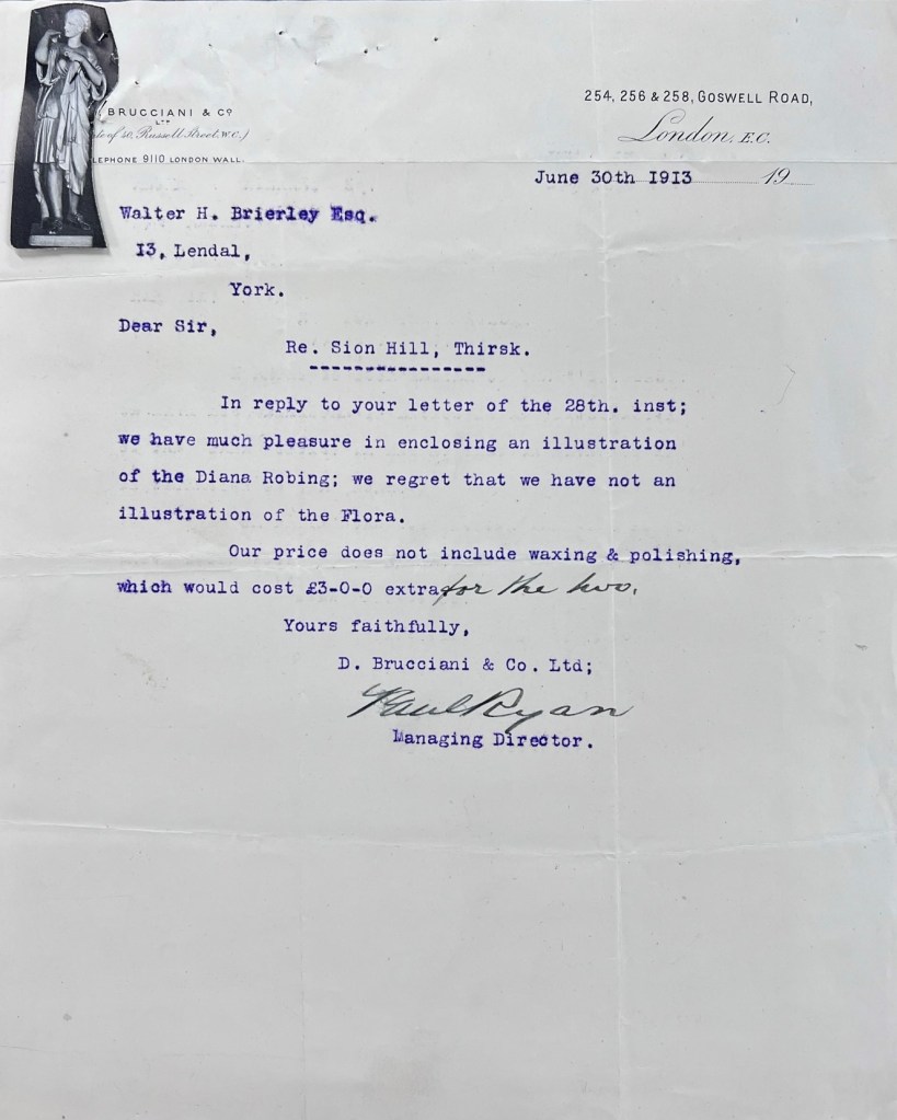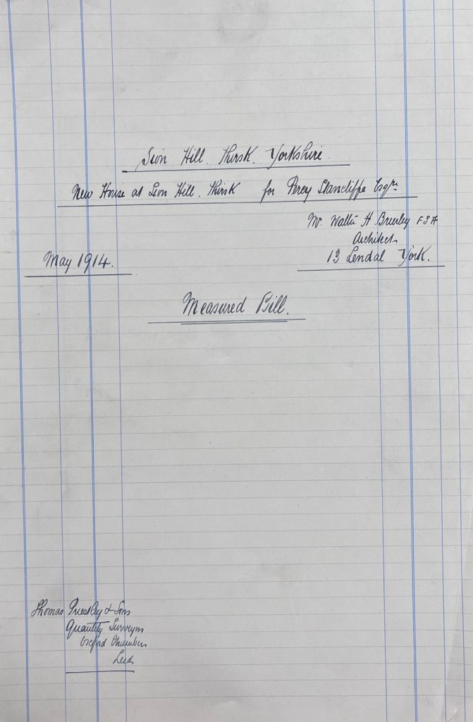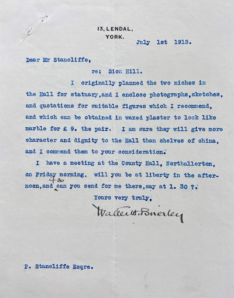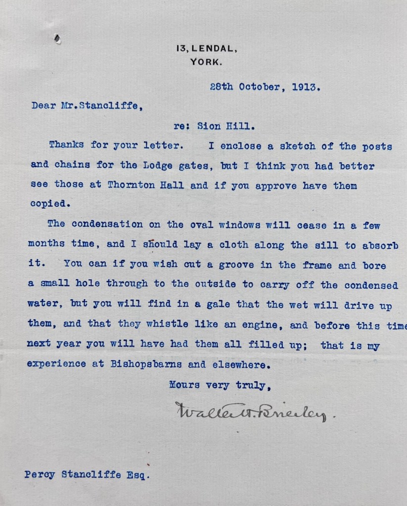 Soon after the auction, and before the purchase was completed, Stancliffe took Coverdale’s advice and set in motion a project to build a new house at Sion Hill, approaching architect Walter H. Brierley (1862-1926) of 13 Lendal, York in November 1911. The earliest surviving correspondence from Brierley is dated 18 December 1911, in which he provided an update on his progress drawing up the plans. A month later, on 18 January 1912, the initial designs were sent to Stancliffe, accompanied by a four-page letter from Brierley outlining his approach to the layout and design, and inviting Mr & Mrs Stancliffe to his own house at Bishopbarns in York to see the fittings (see designs and letters pictured below).