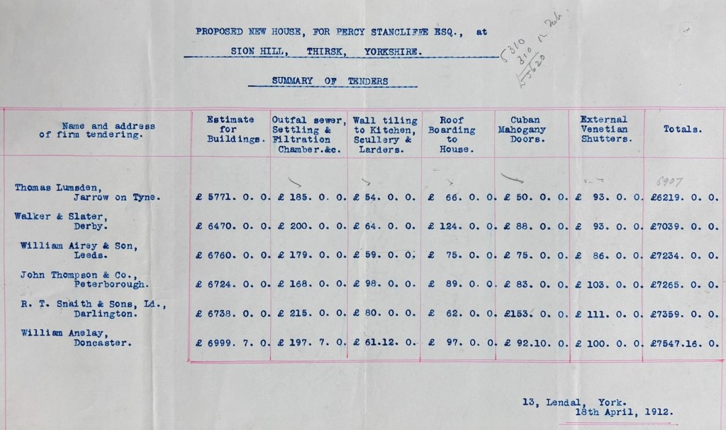 Stancliffe was clearly keen to hear the results of the invitations to tender, which Brierley sent to him on 19 April (see Brierley’s letters of 1 & 19 April 1912 below). Brierley commented on the tenders, which ranged from £6,219 to £7,547 16s as follows: