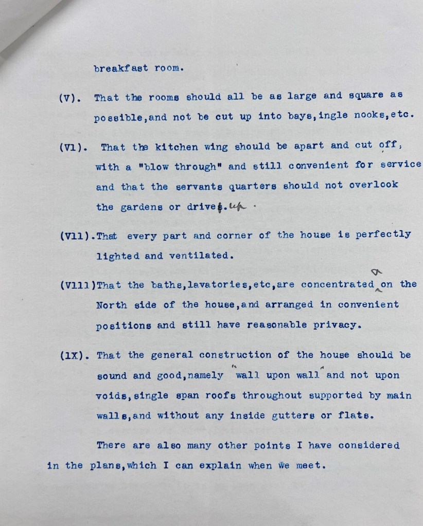 “All the doors, except those that are mahogany, are to be painted (some of them are old doors reused). Those in the servants quarters and kitchen wing could be painted brown oak colour and varnished, which is very serviceable, but white is the best for the bedroom doors, it always looks nice in the country and doesn’t tie you as regards carpets, curtains and wall papers.” Writing to Stancliffe on 4 December 1912, Brierley requested: “Will you kindly ask Mrs Stancliffe whether she would prefer the windows of the bath rooms, lavatories and Butlers pantry and bedroom glazed with clear or obscure glass. I prefer clear glass and muslin curtains on the inside, as I think it looks so much better from the outside.”