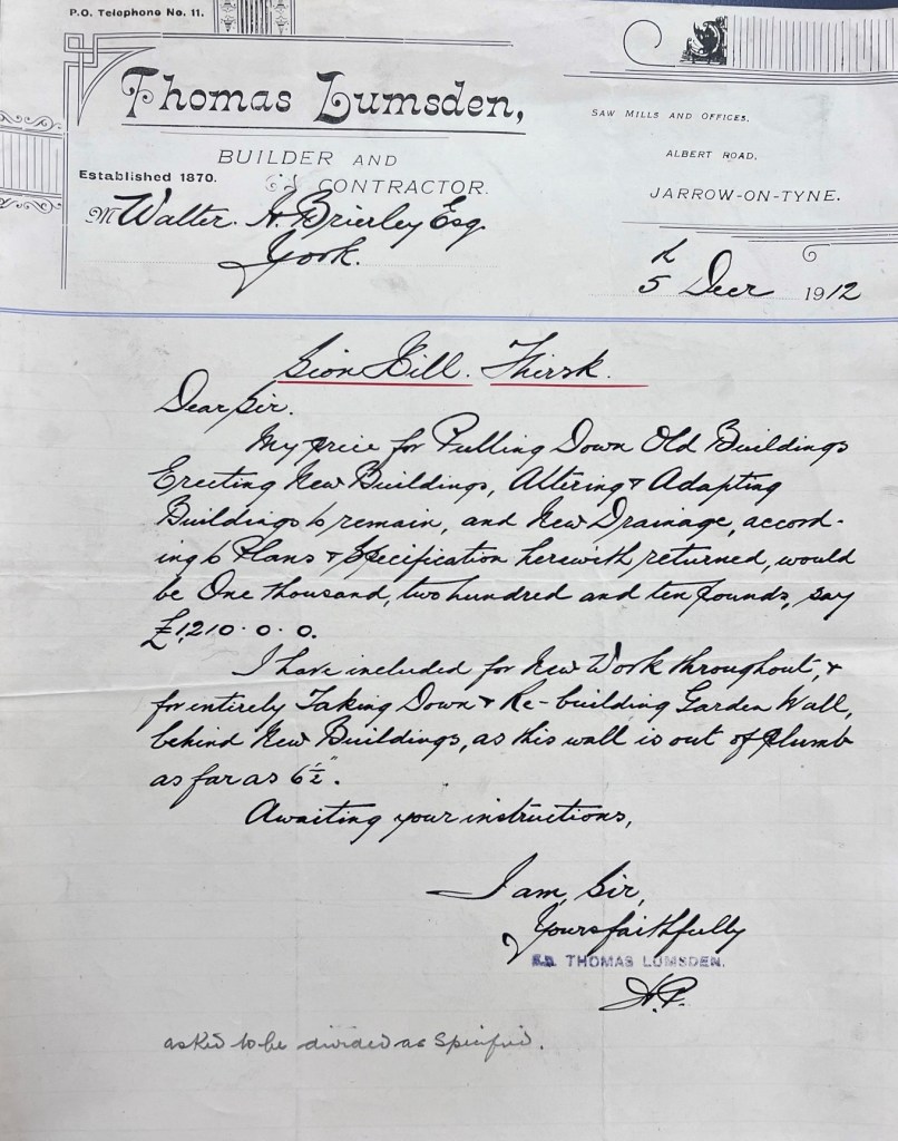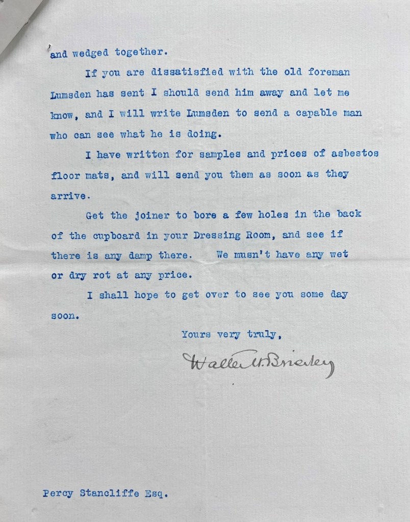 “They vary considerably, and on the whole are lower than I expected….They are all from selected builders of good repute. Lumsden you will see is considerably the lowest, and I don’t think he can do the work satisfactorily and make any profit at his price but I suppose that is his look out. He is at present building a large block of banking premises for me at Newcastle, and has so far given me every satisfaction. He has got on well with his work, and is energetic and business-like, and he is good to deal with, and I believe he is financially sound. I have therefore no alternative but to advise that you accept his tender. I am sorry Anelay is so far out of it, and that Slack will probably have to retire from the command as soon as the foundations are built.” Despite his reservations about the feasibility of Lumsden’s quoted price, Brierley went on to note that “I am glad to find that Lumsden’s tender for the house is within £160 of my original estimate.”