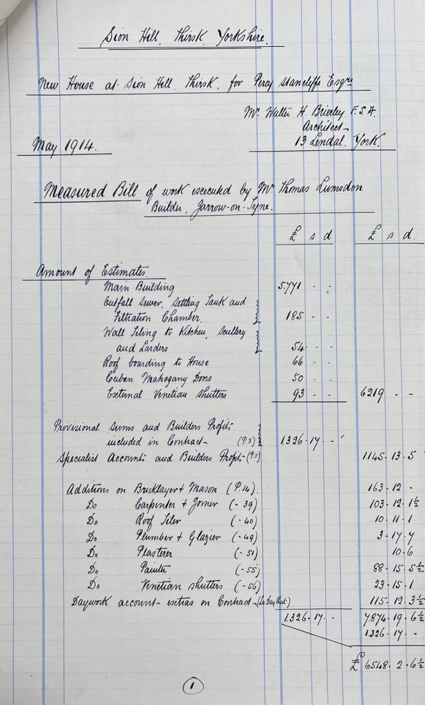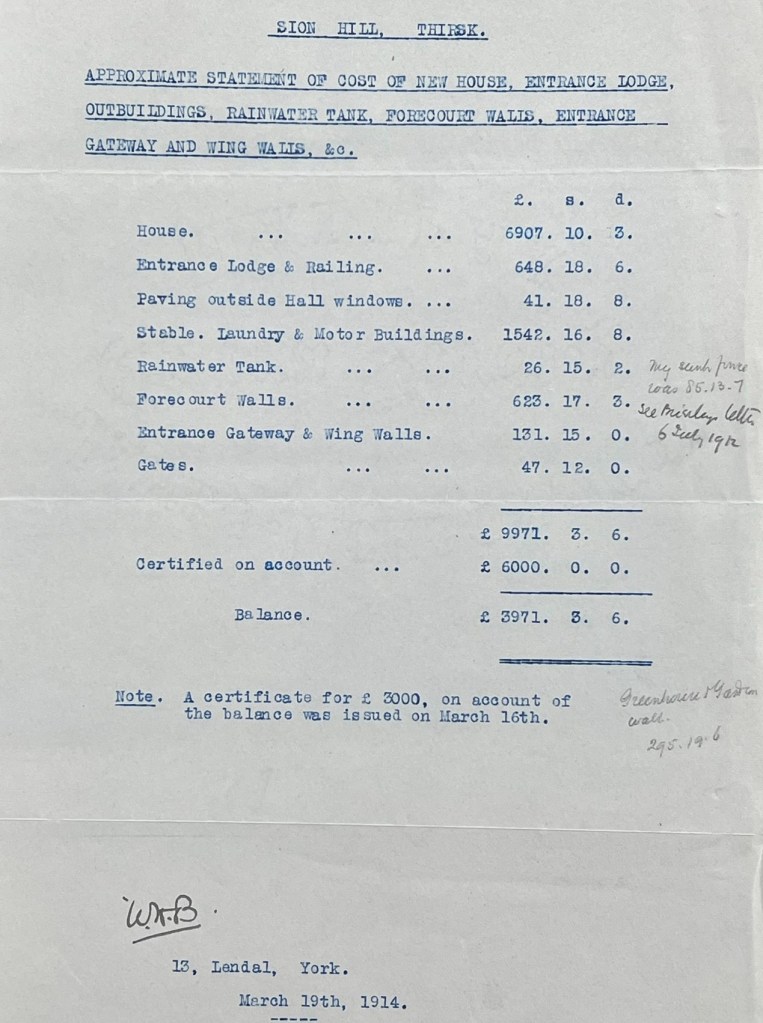- Summary and breakdown of account for the building of the new house at Sion Hill, 27 May 1914 (2 pages)
