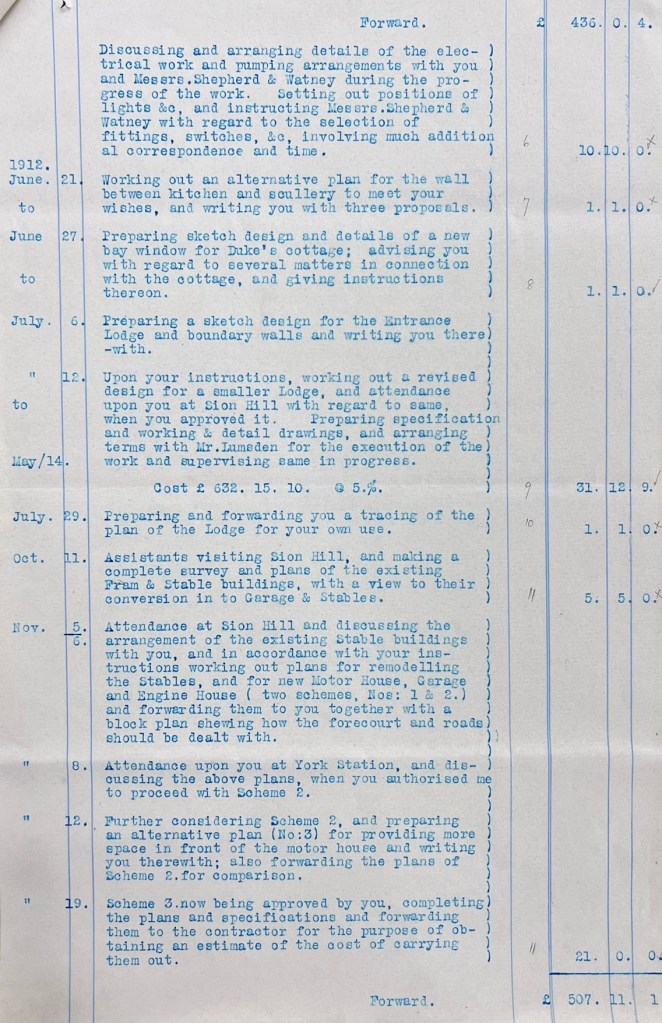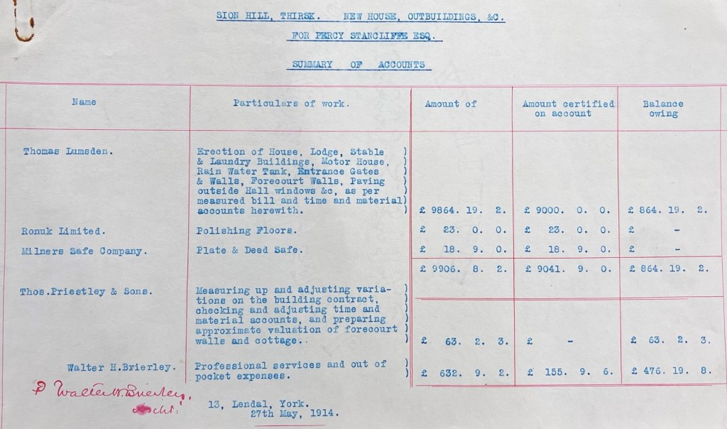 A few weeks later, on 14 April 1914, Brierley wrote to Stancliffe: “Thanks for your letters. The only reason I have not been over is that I have been too busy to find the time.” From the five-page statement of account for professional services submitted by Brierley in May 1914 (see below), which itemises the work he had carried out on the project, we can see that he sent his personal clerk of works to inspect the build five times during April and May 1914 to the point of completion, the final visit taking place on 27 May 1914. Brierley’s costs between November 1911 and May 1914 totalled £632 9s 2d. From the measured bill submitted by Lumsden (see below), the total costs for the house build were £6,937 8s 2d and with additional works to the outbuildings, stables, building the entrance lodge to the north, new walls, paving etc, the total sum overall came to £9,864 19s 2d, in addition to the original £14,000 Stancliffe paid for his portion of the estate following the October 1911 auction. By now, we should not be surprised to learn that Stancliffe, via his agent Coverdale, raised a number of queries about these final costs, to which Brierley responded on 11 June 1914 (see below).