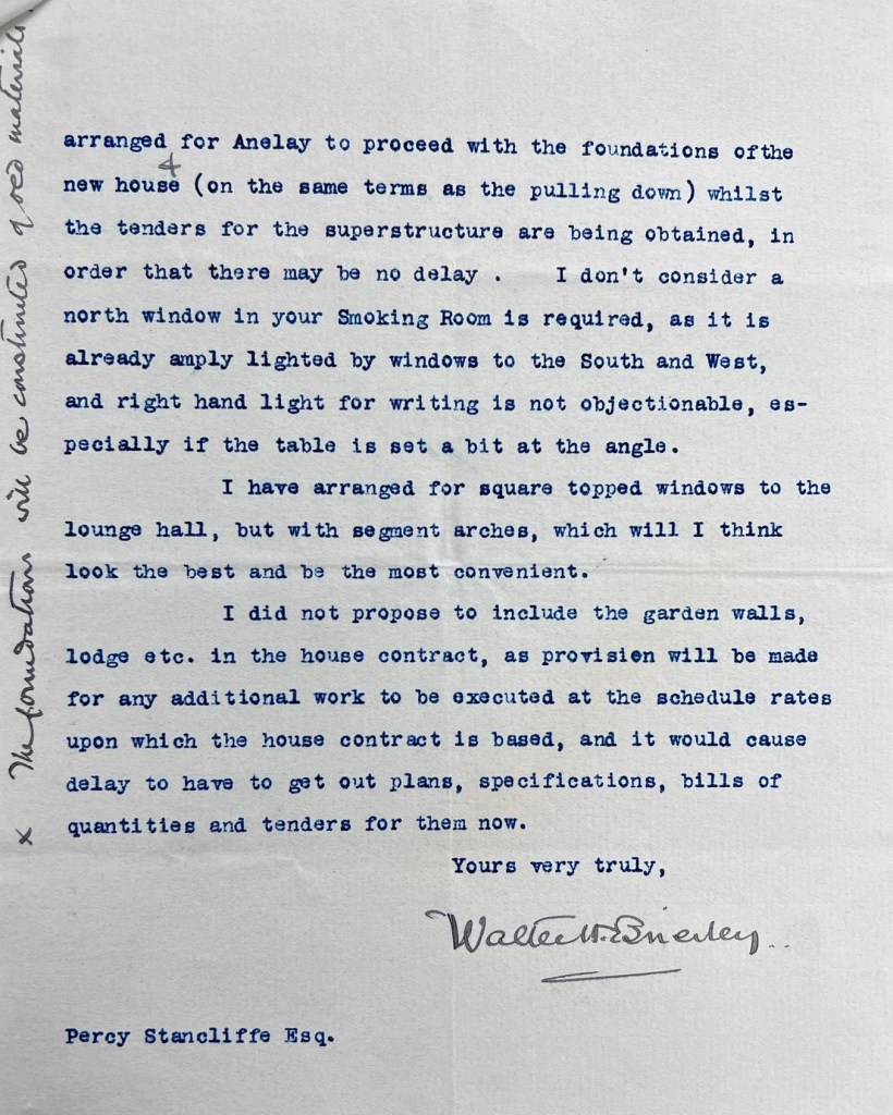 “The house looked very nice, and I am satisfied that the work is durable and good; it is only in the little finishing touches that Lumsden is not quite up to the mark.” He also wryly adds that: “We can hardly expect him to be up to Anelay’s standard when his price was £1300 lower than Anelay, who was already on site and wanted the job, and £600 lower than any of the other contractors.”