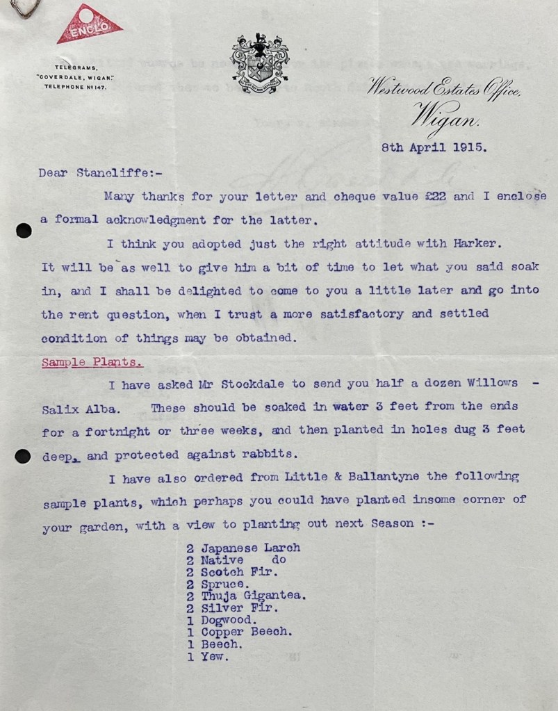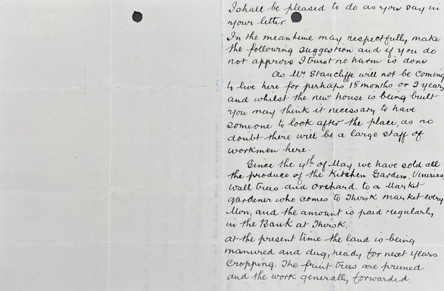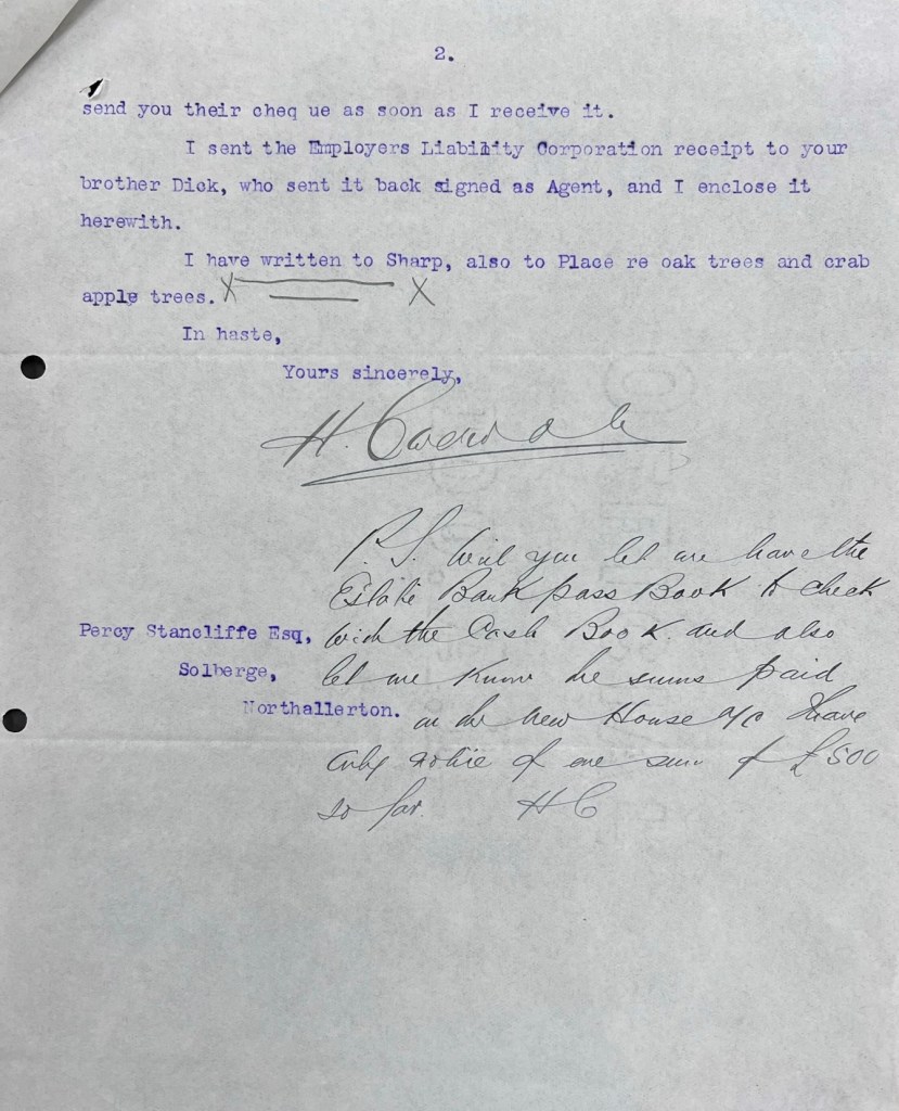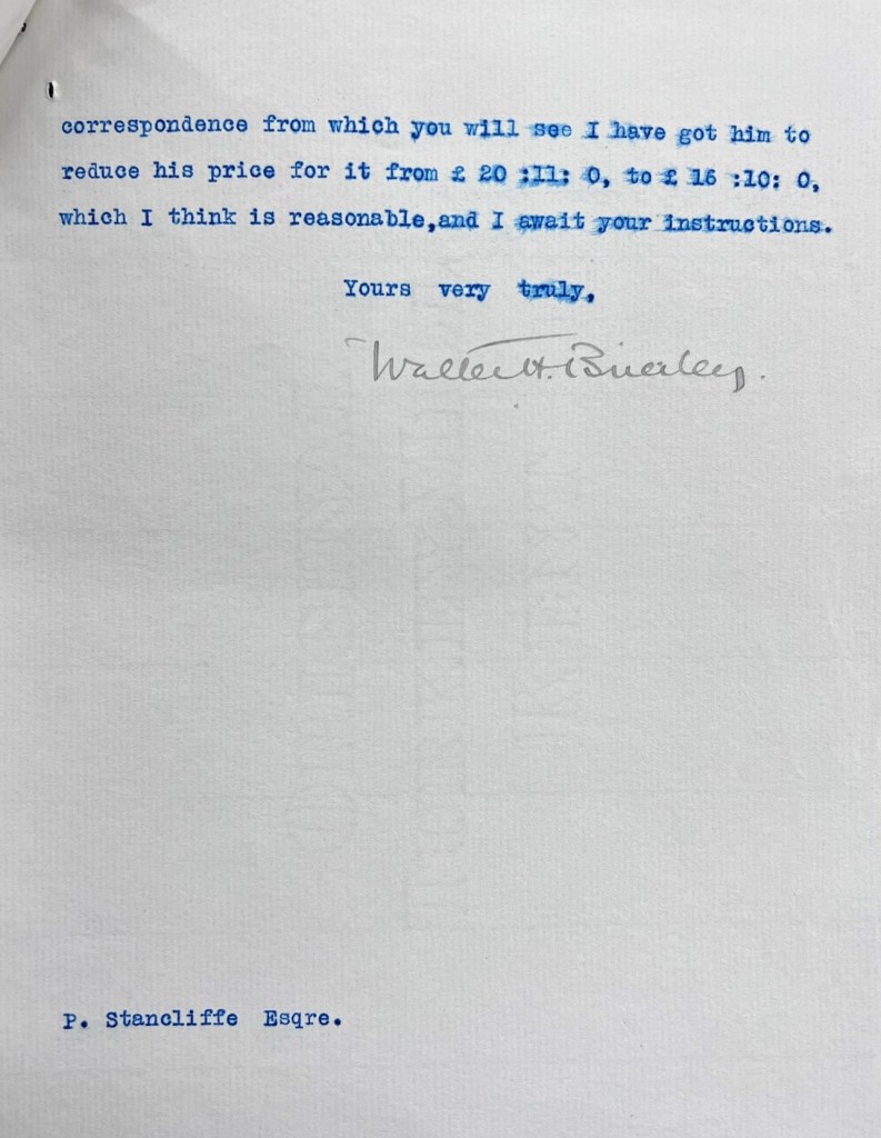 “My dear Stancliffe, I had to go to £23,000 or let it be put up again in lots and I was afraid that might not do us any good. There were very few people in the room and my opening bid of £18,000 was the only bid. So they withdrew the property and asked me to come up and talk to them. They asked £23,000. I offered them £22,000, but it was no use, they wouldn’t have it…. I think you have done very well to get the place as a residential property for £14,000….I hope that you will get the water and that you and your wife and your boys will like the place and be very happy there and that we shall be good and happy neighbours for many years” [ZXW 2/2].
