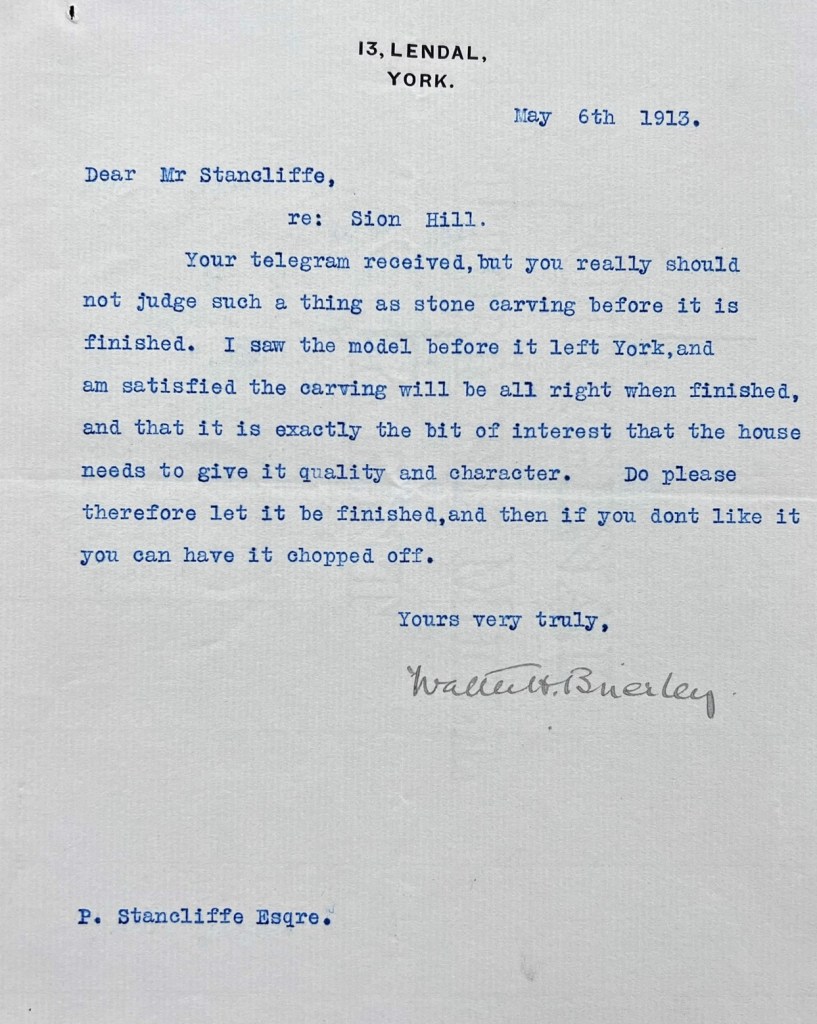 The following year, on 6 and 8 May 1913, there had clearly been disagreement over the carving above the front door, which was not to Stancliffe’s liking, and Brierley wrote two letters (see below):