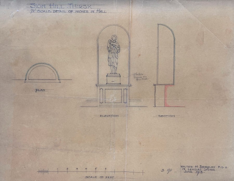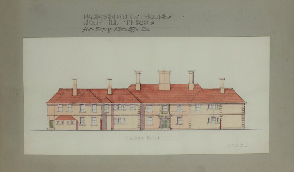 The fascinating story of the building of the house can be told through the records that survive within the archive collection of Stancliffe family letters and papers held at the County Record Office [ZXW]. This collection includes documents and correspondence relating to the purchase of Sion Hill in 1911 by Percy and Ethel Stancliffe, the subsequent demolition of the existing house and the building of a new house between 1912 and 1914, designed by Walter H. Brierley of York.
