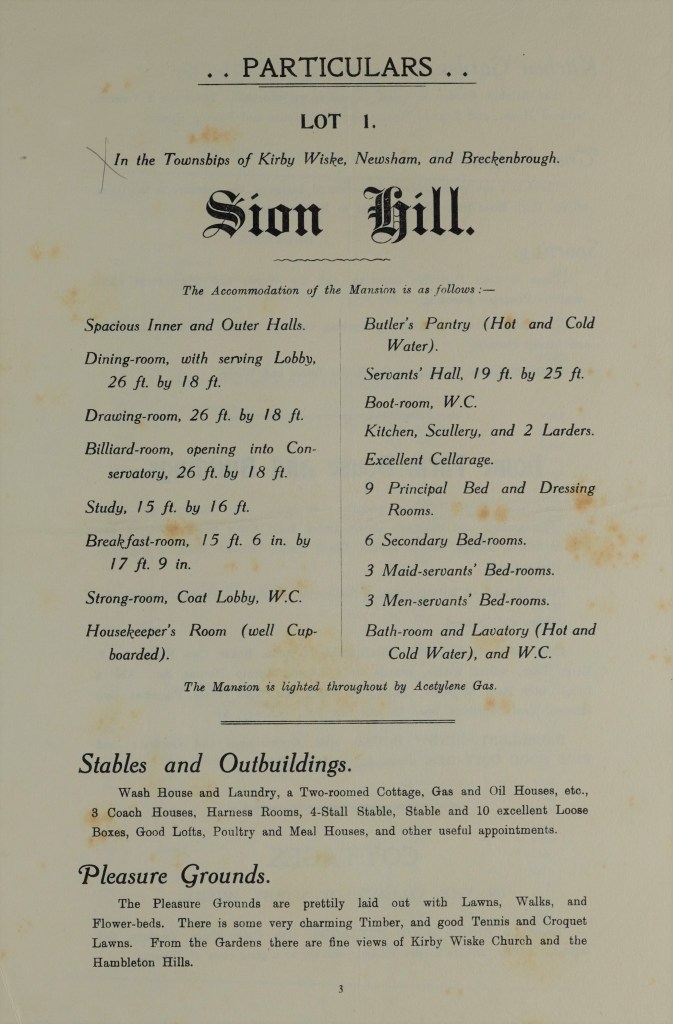 Following the death of the Hon. George Lascelles, who had owned Sion Hill since 1867, the Sion Hill Estate was offered for sale by auction in York on 26 October 1911. In the sale catalogue (see pages pictured below), the house at Sion Hill was described as a ‘moderate-sized mansion’ [ZXW 2/1].