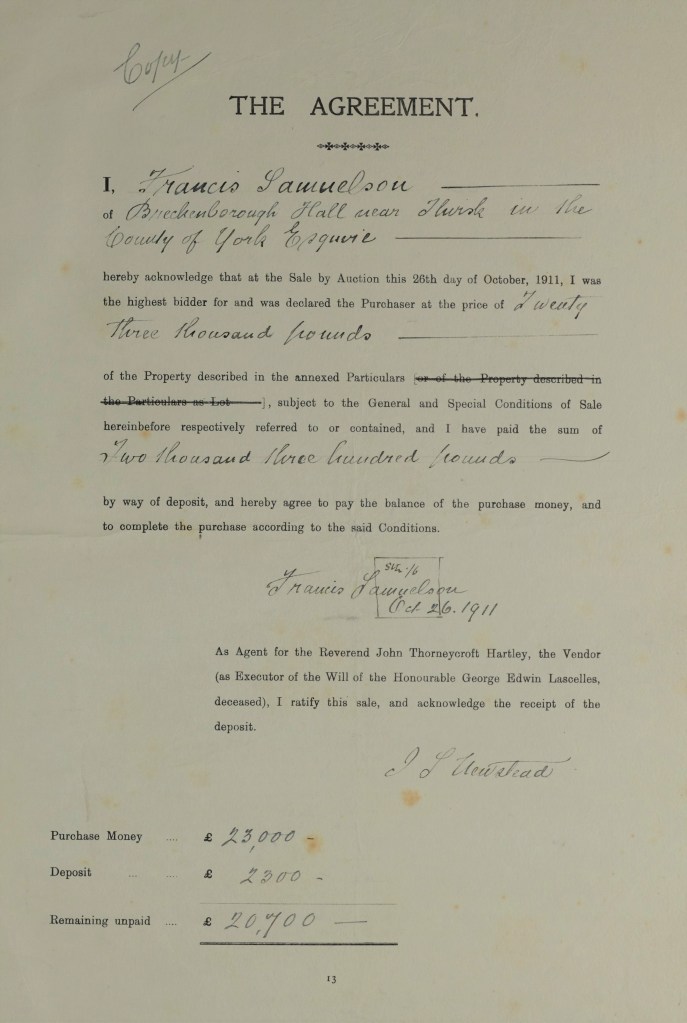The deed of conveyance for the purchase of the estate was completed on 1 February 1912, naming Lascelles’ sons and son-in-law as the vendors, who were executors of his estate. One, the Hon. Alfred George Lascelles, was Chief Justice of Ceylon (now known as Sri Lanka). The conveyance was registered with the North Riding Registry of Deeds on 2 May 1912. In this deed, Francis Samuelson is named as the ‘original purchaser’ and Ethel Stancliffe, Percy’s wife, as the ‘sub-purchaser’ [NRRD 233/1417/474].