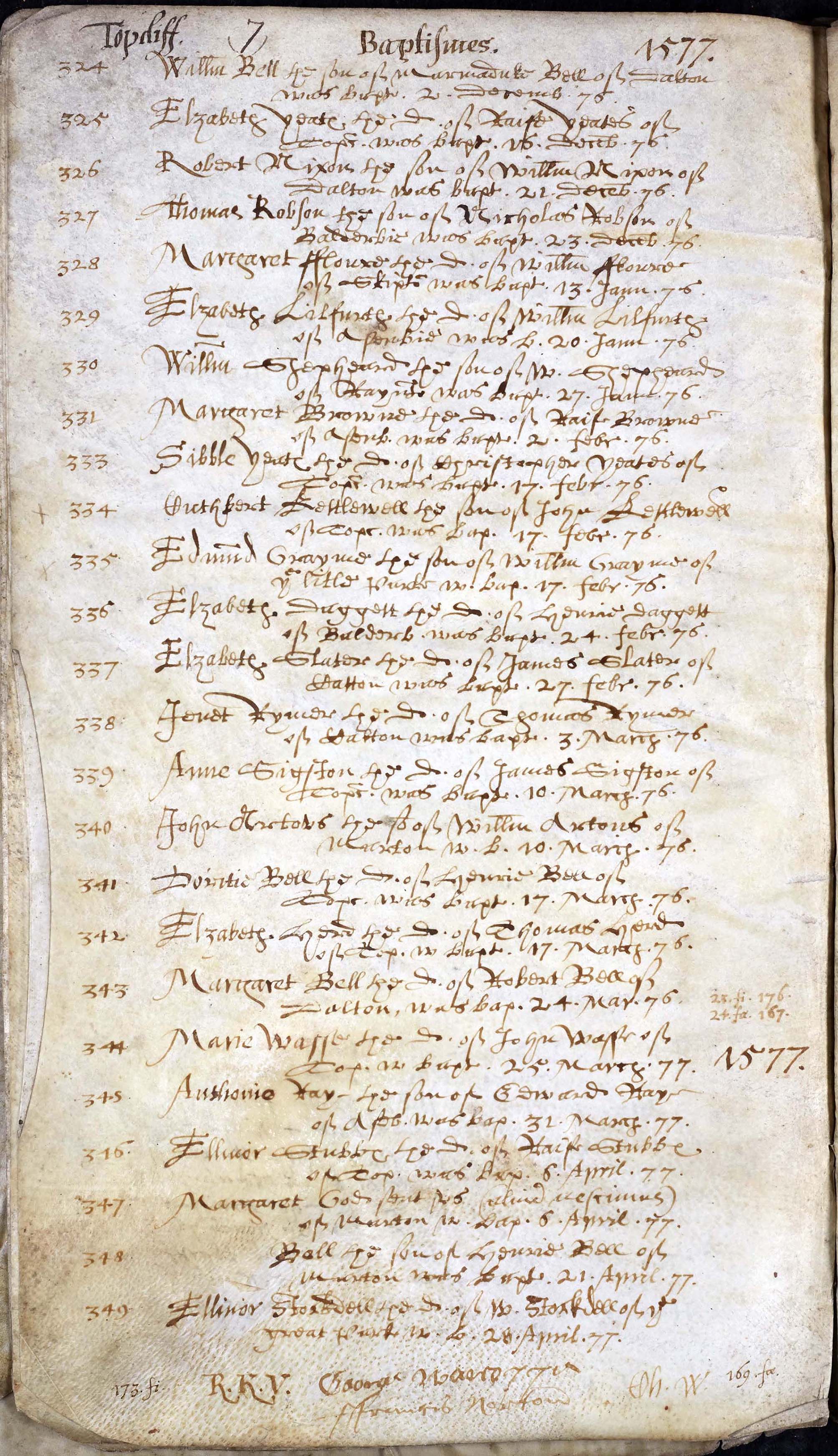 - Left: PR/TOP 1/1 Pages from the earliest parish register of baptisms, marriages and burials (1570-1697) recording baptisms in 1577 and burials in 1607/8