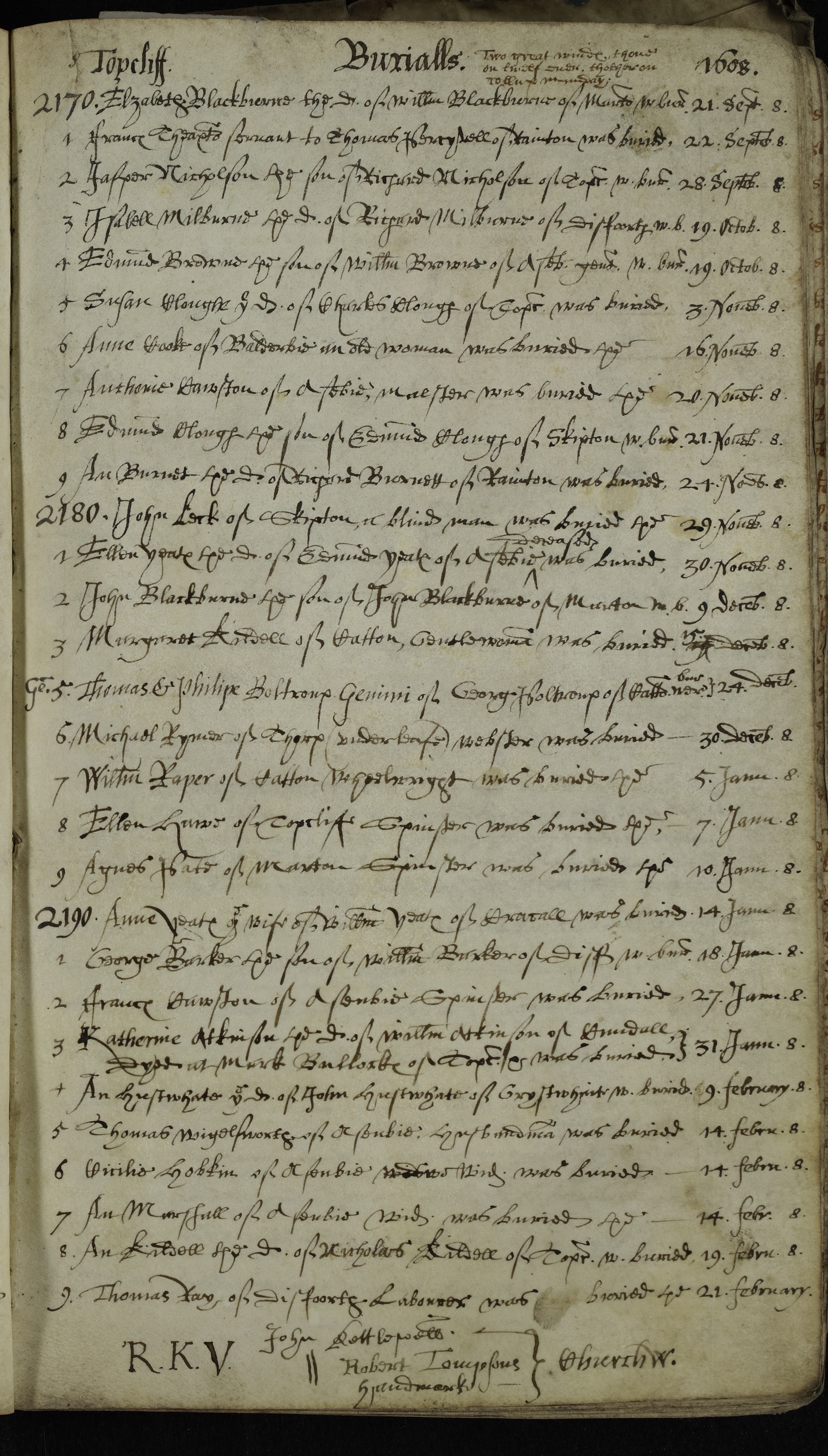 A particularly extensive and varied collection of parish records is held for the parish of Topcliffe (PR/TOP). This collection includes parish registers of baptisms (1570-1949), marriages (1570-2007) and burials (1570-1957) (PR/TOP 1/1-24) for the church of St Columba, as well as examples of many of the classes of records that you might hope to find in a parish record collection but which, in many cases, do not always survive.