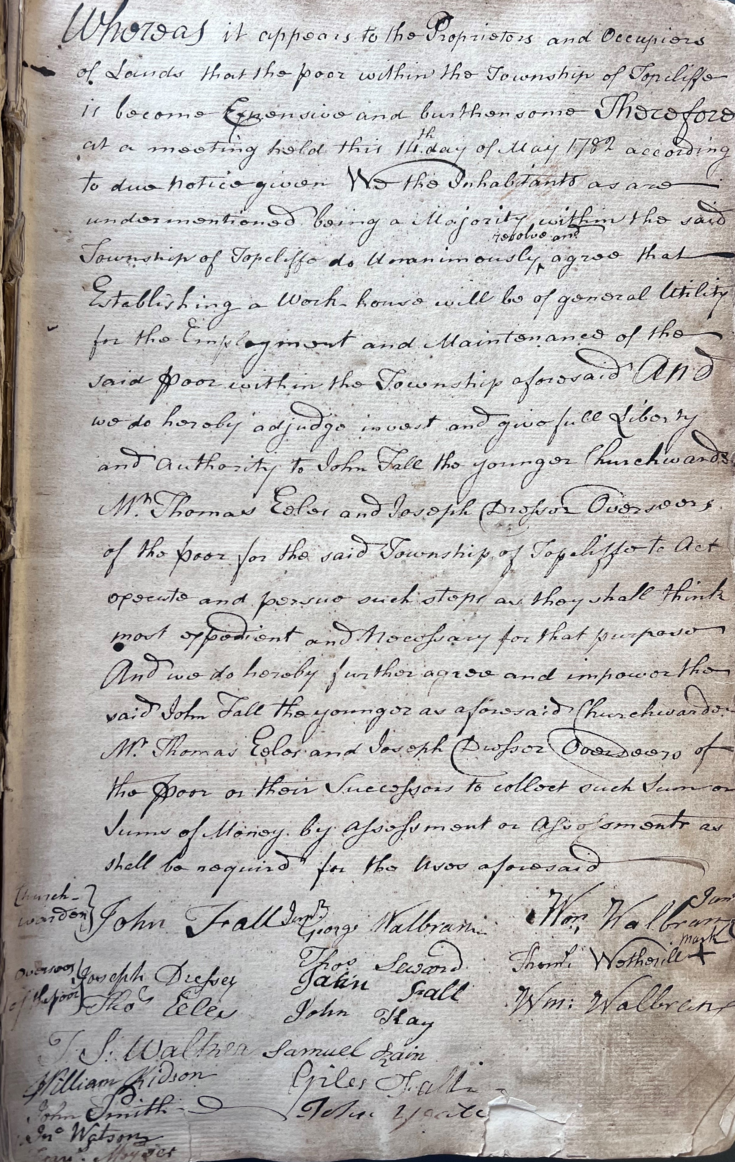 Other documents relating to the care of the poor of the parish concern the establishment of a workhouse towards the end of the eighteenth century (PR/TOP 2/3). A public meeting was called by the churchwardens and overseers c.1782 (presumably following the passing of Gilbert’s Act, 1782), at which the majority of the inhabitants agreed “to establish a poorhouse and workhouse for lodging, keeping, maintaining and employing … poor persons“, although in effect it appears to have been repair of an existing house.