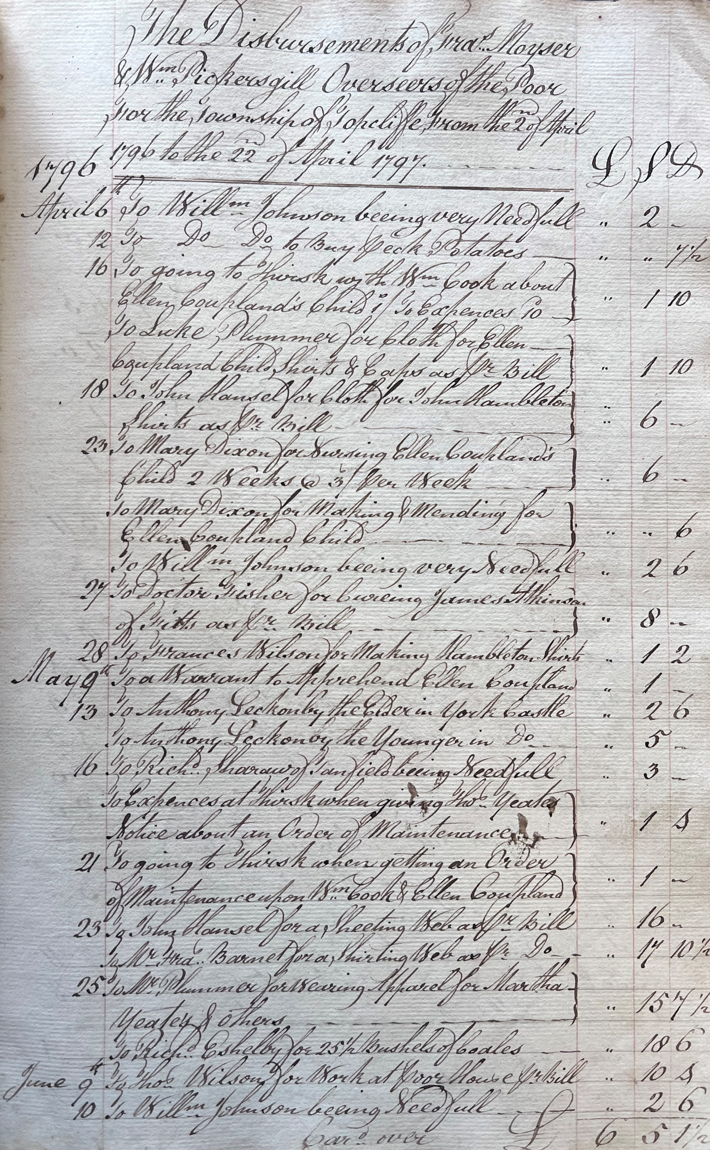 PR/TOP 2/3 Overseers’ account book for Topcliffe (1765‑1815), including agreement to establish a poorhouse, May1782 (left) and a page recording overseers’ disbursements, April 1797 (right)