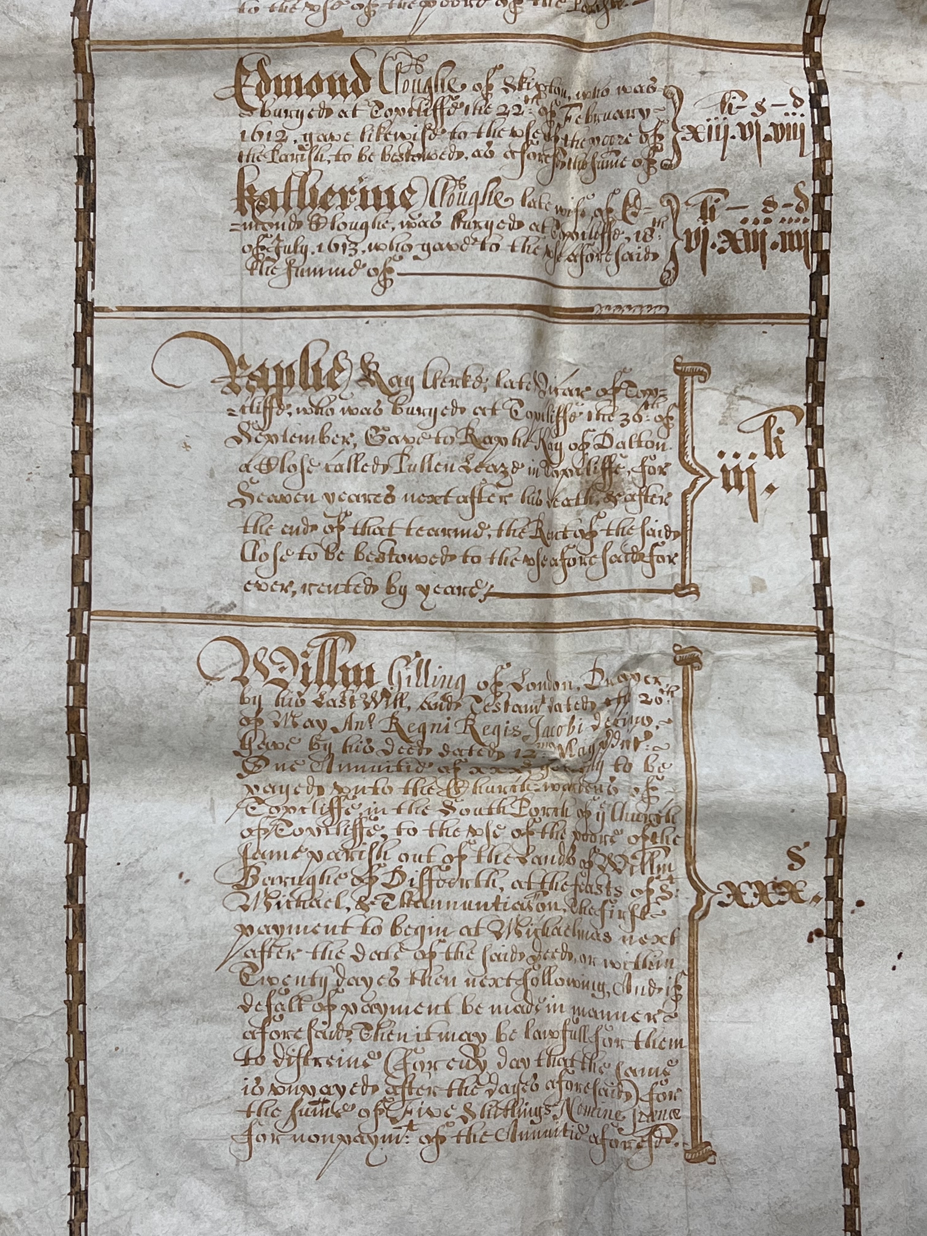 A copy of the decree can be found with this collection (PR/TOP 4/2/1-2), as can an account book for the feoffees 1801-1857, which includes details of payments to the poor, the election of a master and the names of the free scholars elected (PR/TOP 2/6). Also in relation to charities, the Topcliffe records include a list of charitable donations and bequests made between 1548 and 1612, elaborately written on a large sheet of parchment (PR/TOP 4/1/1).