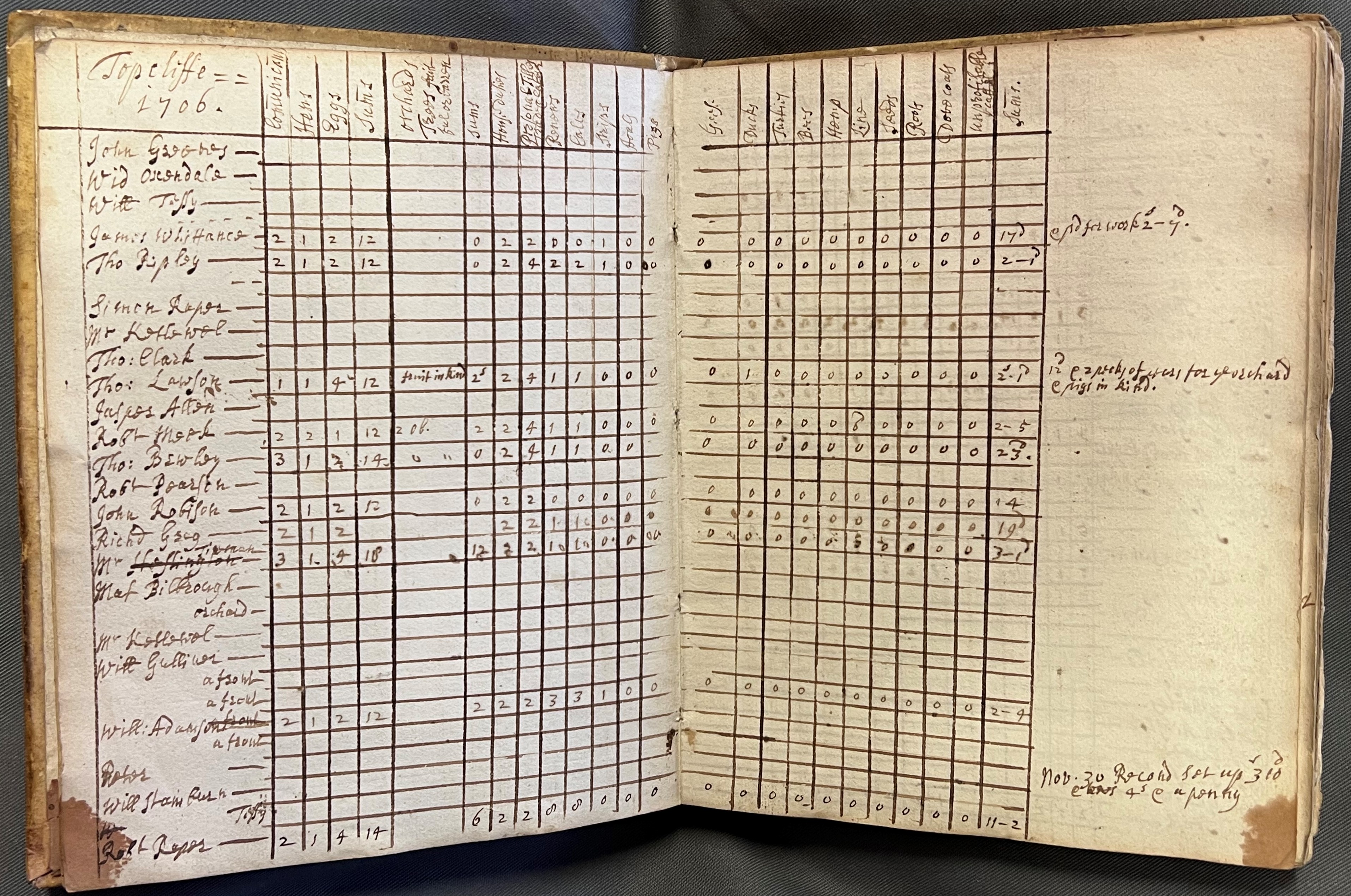 The survival of a series of tithe account books for Topcliffe is also unusual. The accounts date from 1706 to 1729 after which there is a long gap until 1771 and then another series of accounts from 1815 to 1821 (PR/TOP 6/1-20). The accounts give the names of those paying tithes in Topcliffe and other townships within the parish, the goods on which tithes were raised – hens, eggs, foals, pigs, geese, ducks, turkey, seeds, bees, dovecotes etc., and the amounts received. With the absence of payments on corn, hay and wool, it seems that these were the accounts of the “small” tithes payable to the vicar. The general custom was that the “great” tithes of corn, hay and wool were payable to the rector, in this case the Dean and Chapter of York, and the “small” tithes to the vicar.