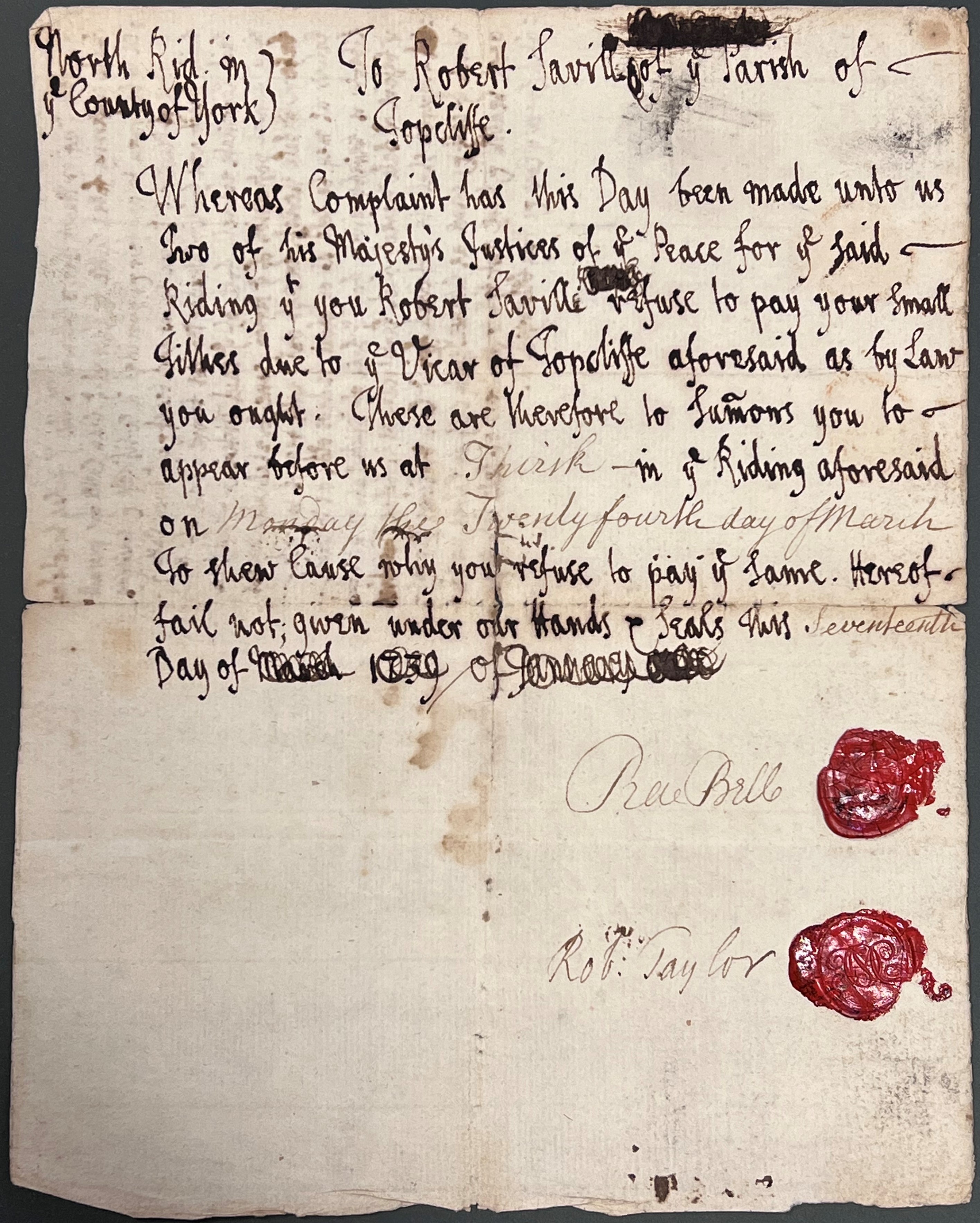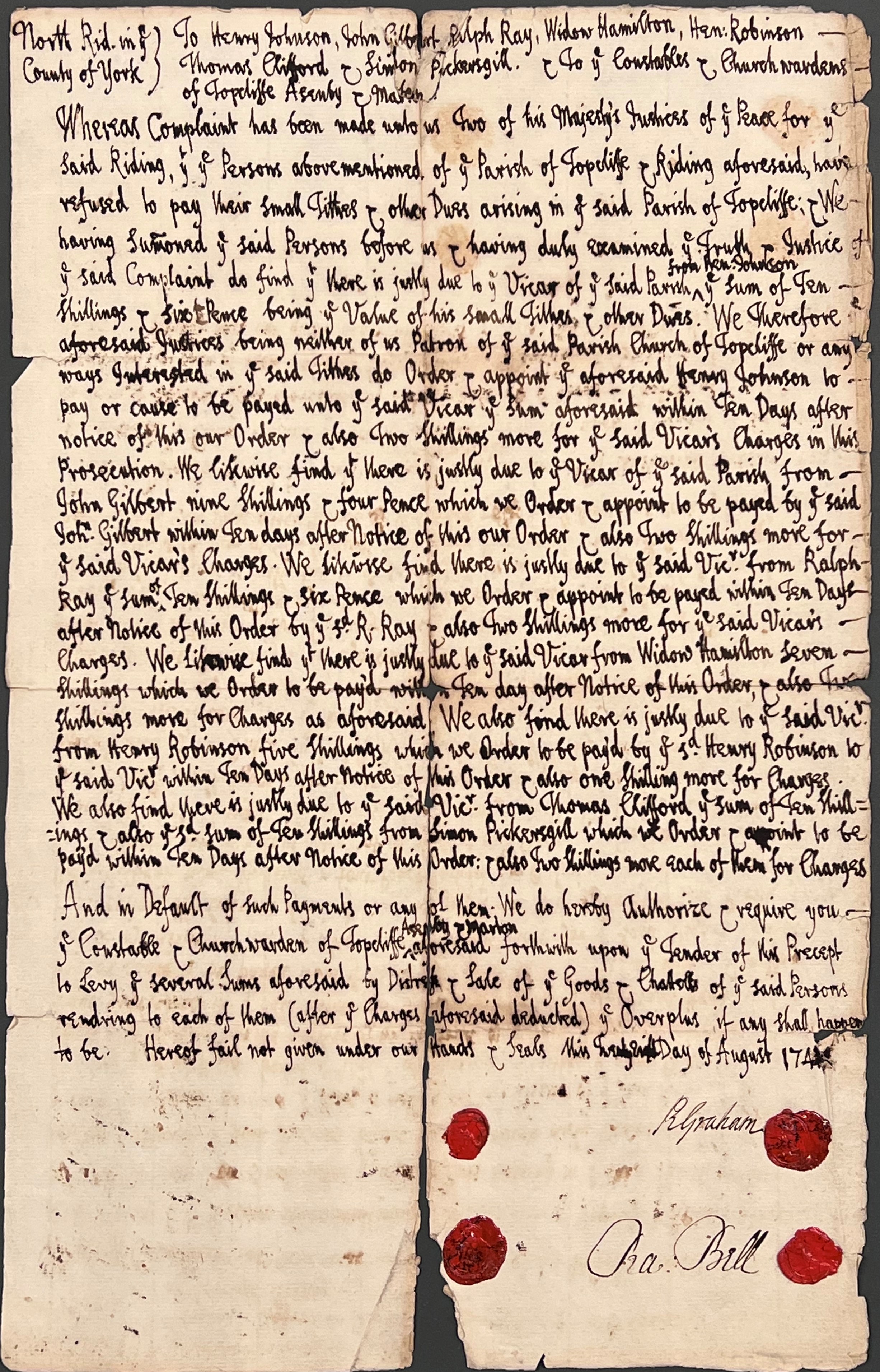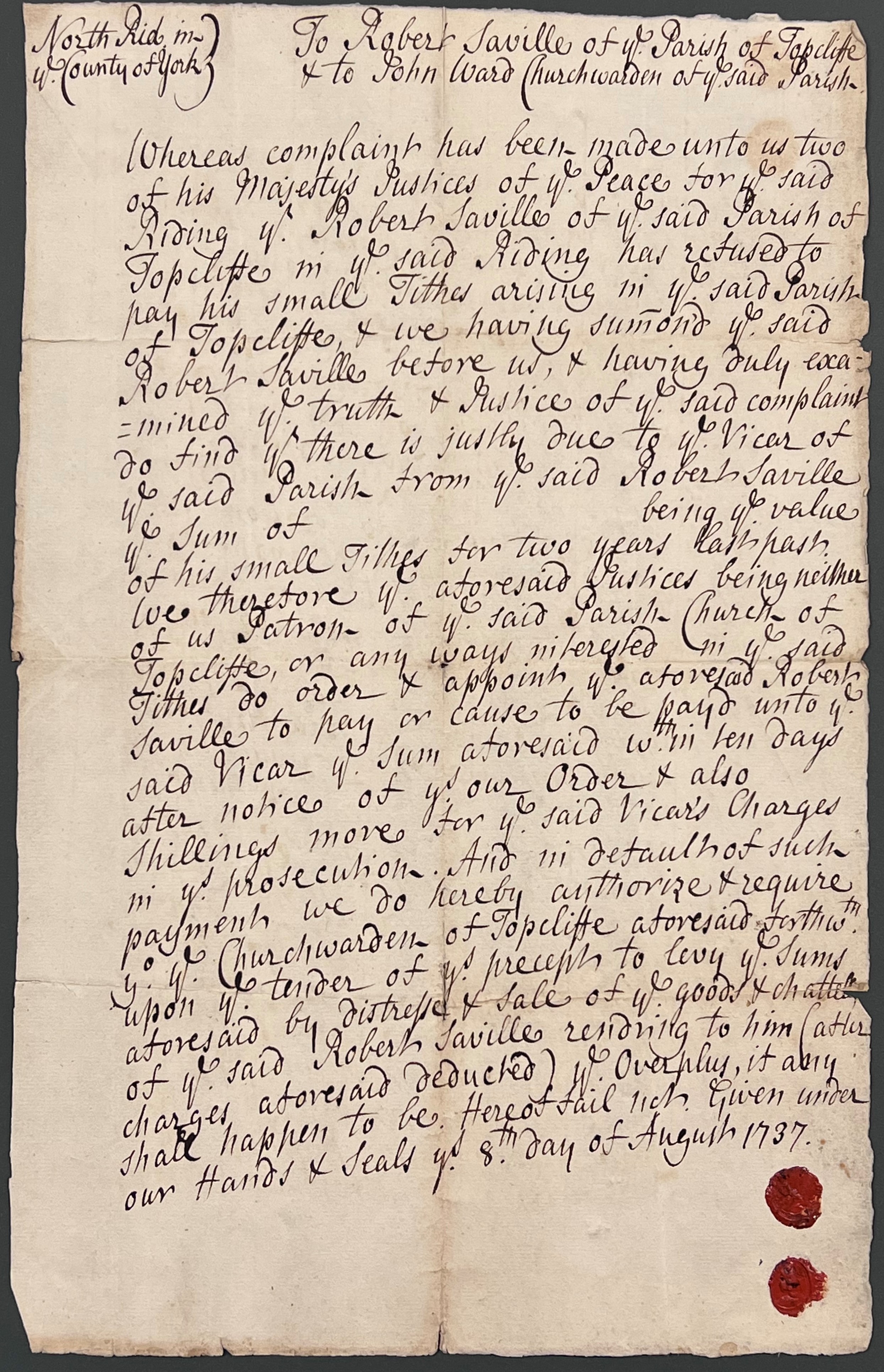 PR/TOP 6/2 Papers relating to complaints made to the Justices of the Peace regarding Robert Saville, who refused to pay his small tithes in the parish of Topcliffe, 1737-1740s