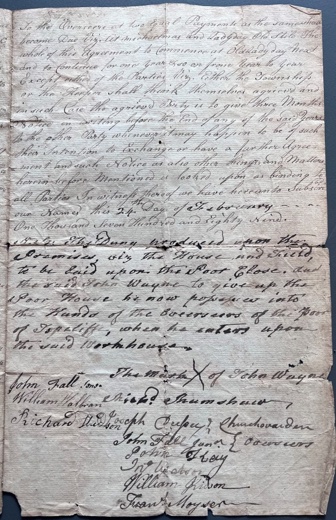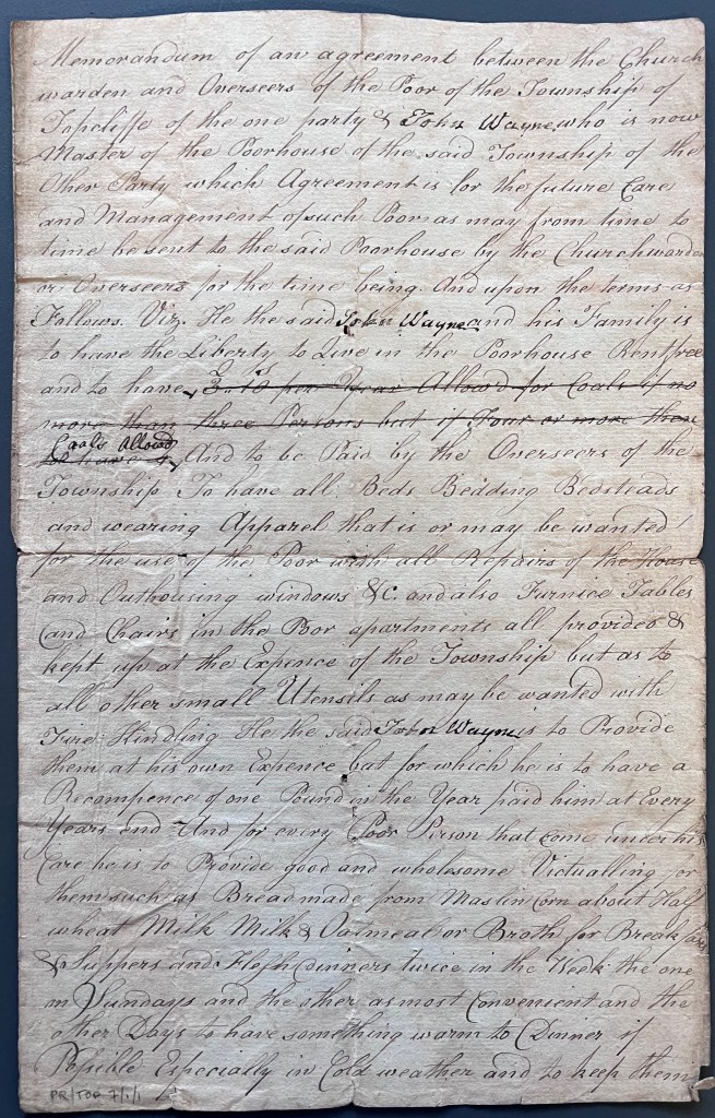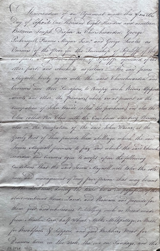 Agreements between churchwardens and overseers and occupiers of the poorhouse for the care and management of inmates: with John Wayne, Master of the Poorhouse, 24 February 1789 (PR/TOP 7/1/1 – images 1-3) and with James Meynell, 4 Apr 1819 (PR/TOP 7/1/3 – images 4-6)