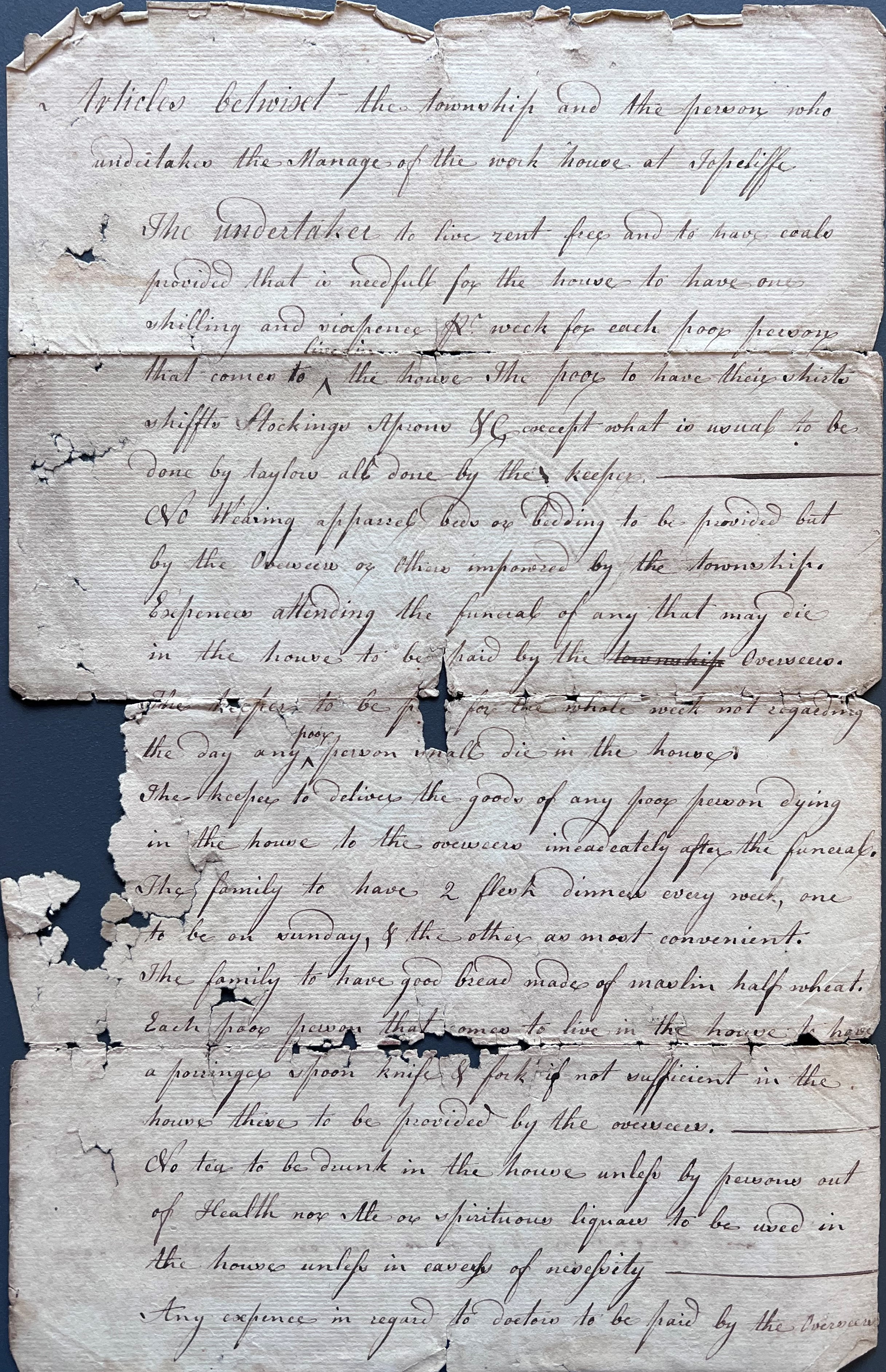 In 1789, an agreement was entered into by the churchwardens and overseers with John Wayne, then master of the poorhouse, for the care of “such poor as may from time to time be sent to the said poorhouse“. The master was to provide “good and wholesome victualling” for them with milk and oatmeal or broth for breakfast and supper and a “flesh dinner” twice a week. The other days, they were to have “something warm to dinner if possible especially in cold weather” and the master was to keep them “clean and decent by washing and mending for them that cannot do for themselves their shirts, shifts, stockings etc“. He was allowed to employ them in any business he found them capable of, and to allow them 2d out of every 1s that they might earn. Other similar agreements exist for 1806, 1819 and 1831 (PR/TOP 7/1).
