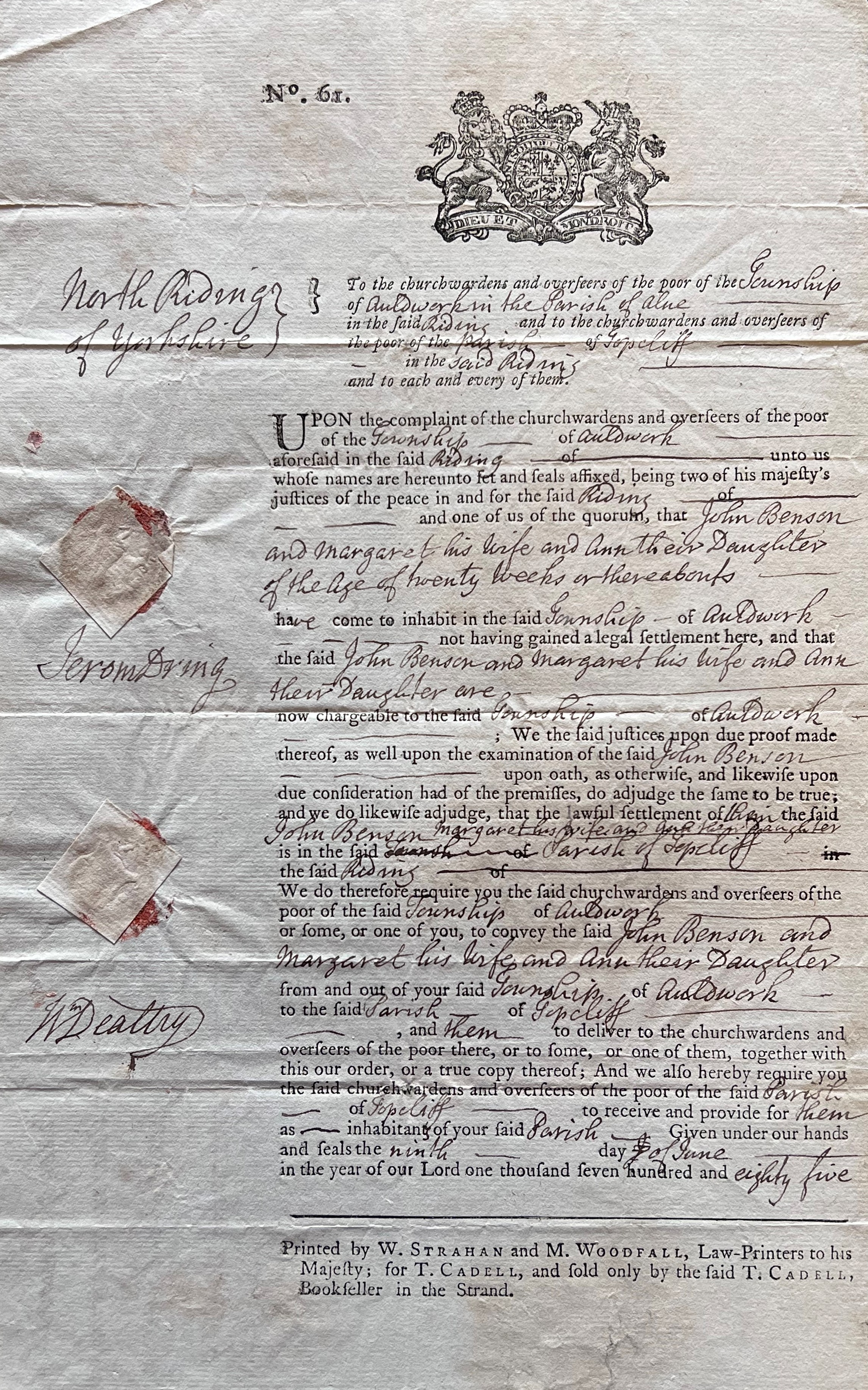 - PR/TOP 7/2 Removal order of John Benson, his wife and daughter, 9 June 1785