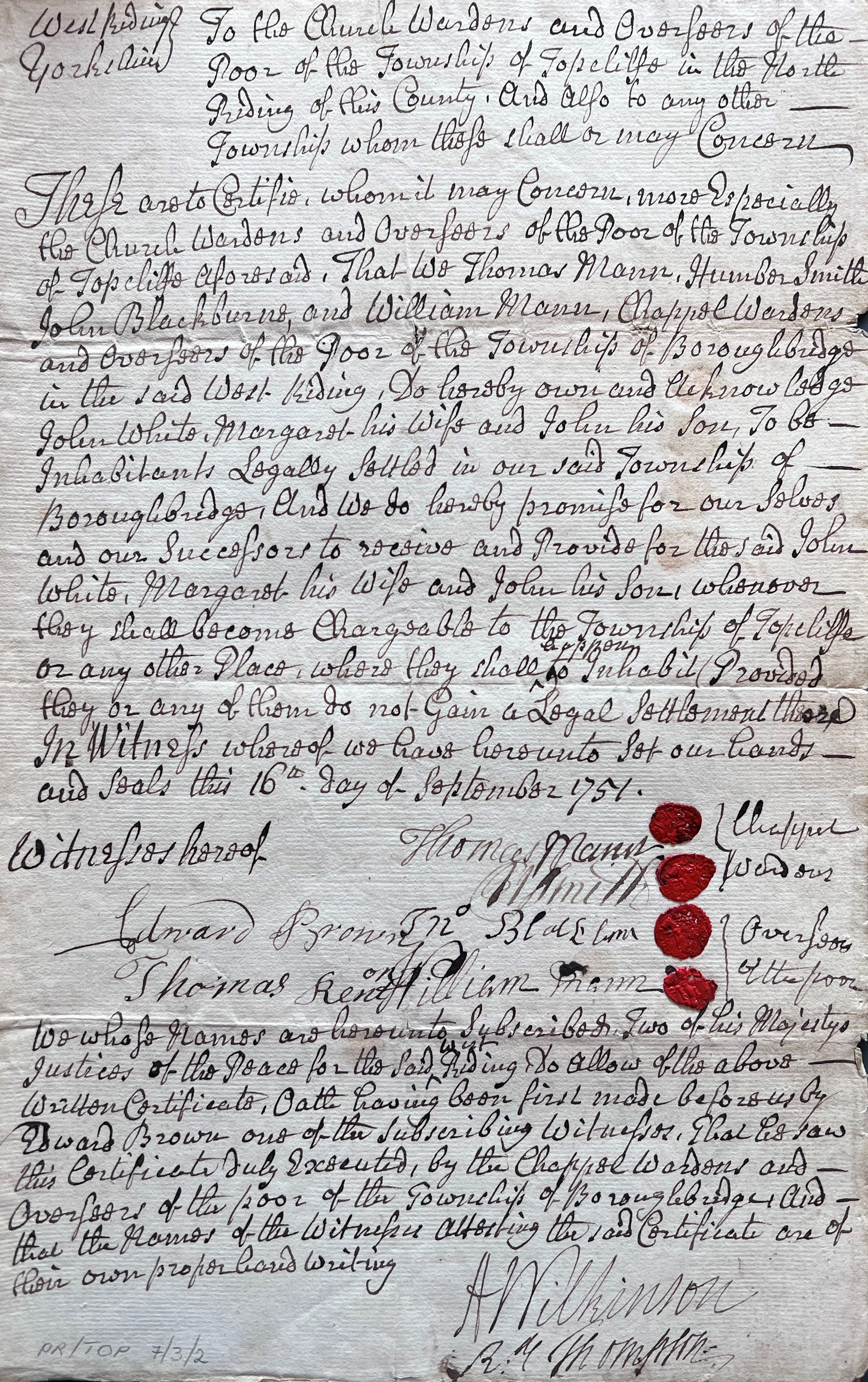 The Topcliffe records include a volume of churchwardens’ and overseers’ accounts dating from the mid seventeenth century, one of the earliest such volumes to be deposited at the Record Office (PR/TOP 2/1, 1651-1773). Removal orders (PR/TOP 7/2, 1781-1836), settlement certificates (PR/TOP 7/3, 1751-1825), bastardy orders (PR/TOP 7/4, 1737-1834) and apprenticeship indentures (PR/TOP 7/5, 1748-1827), all much sought after by family historians, also survive from Topcliffe and from only a handful of other parishes within North Yorkshire. As individual documents, they were far more vulnerable to destruction or disposal than more substantial volumes.