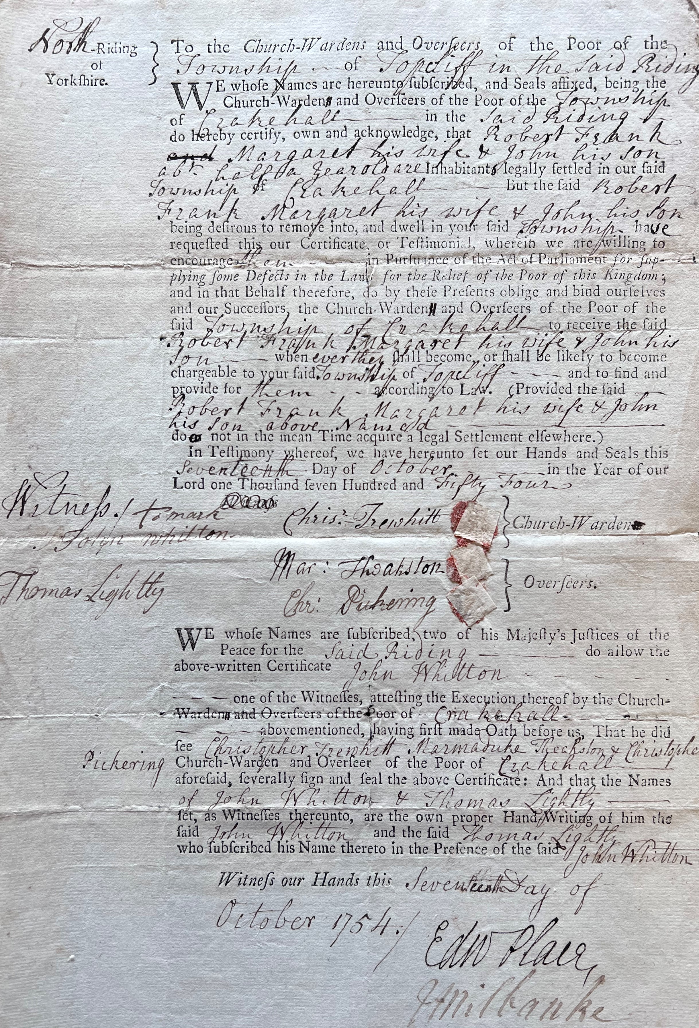 - PR/TOP 7/3/4 Settlement certificate of Robert Frank, his wife and son, 17 October 1754