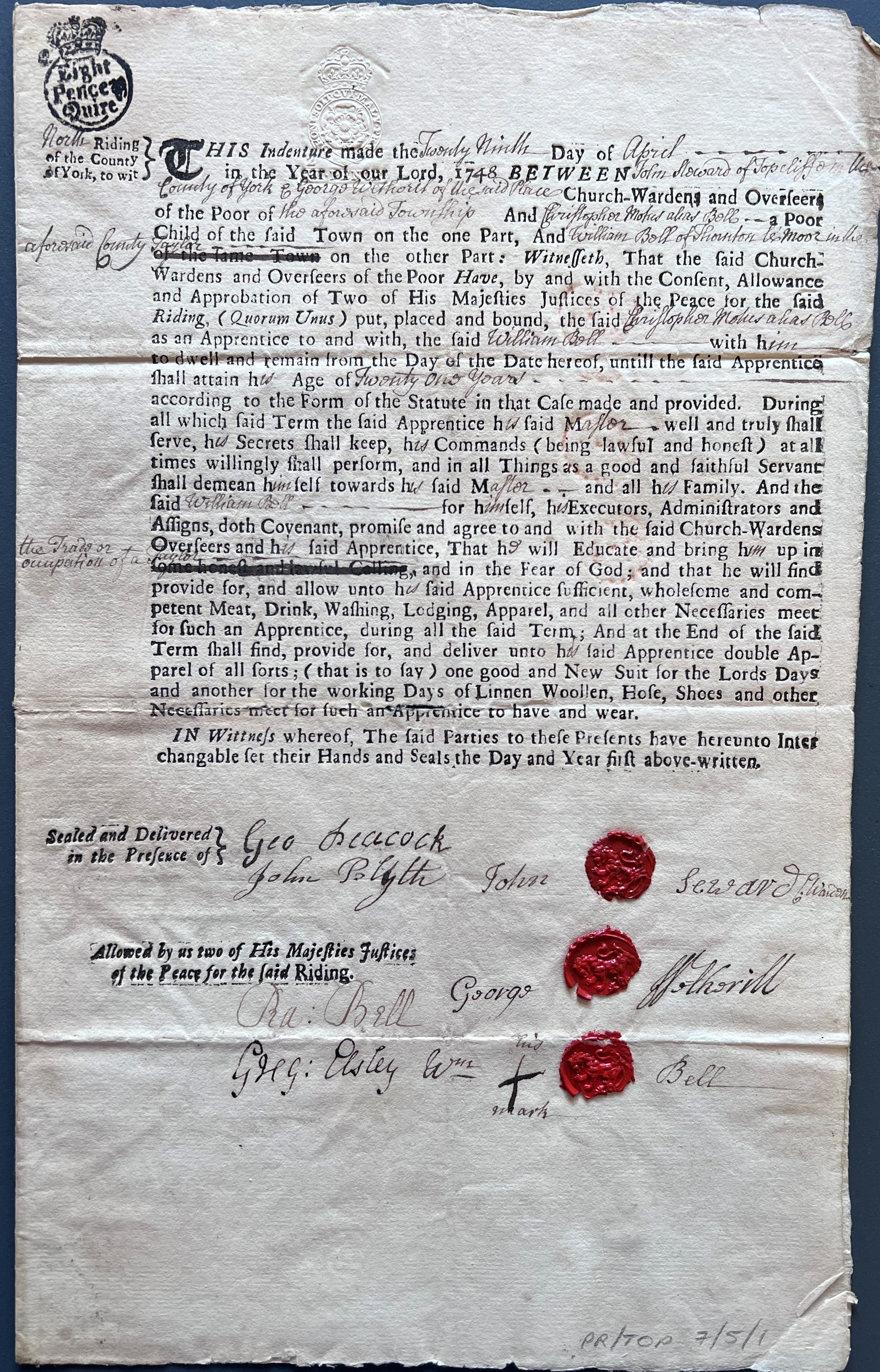 - PR/TOP 7/5/1 Apprenticeship indenture of Christopher Mokes alias Bell, 29 April 1748