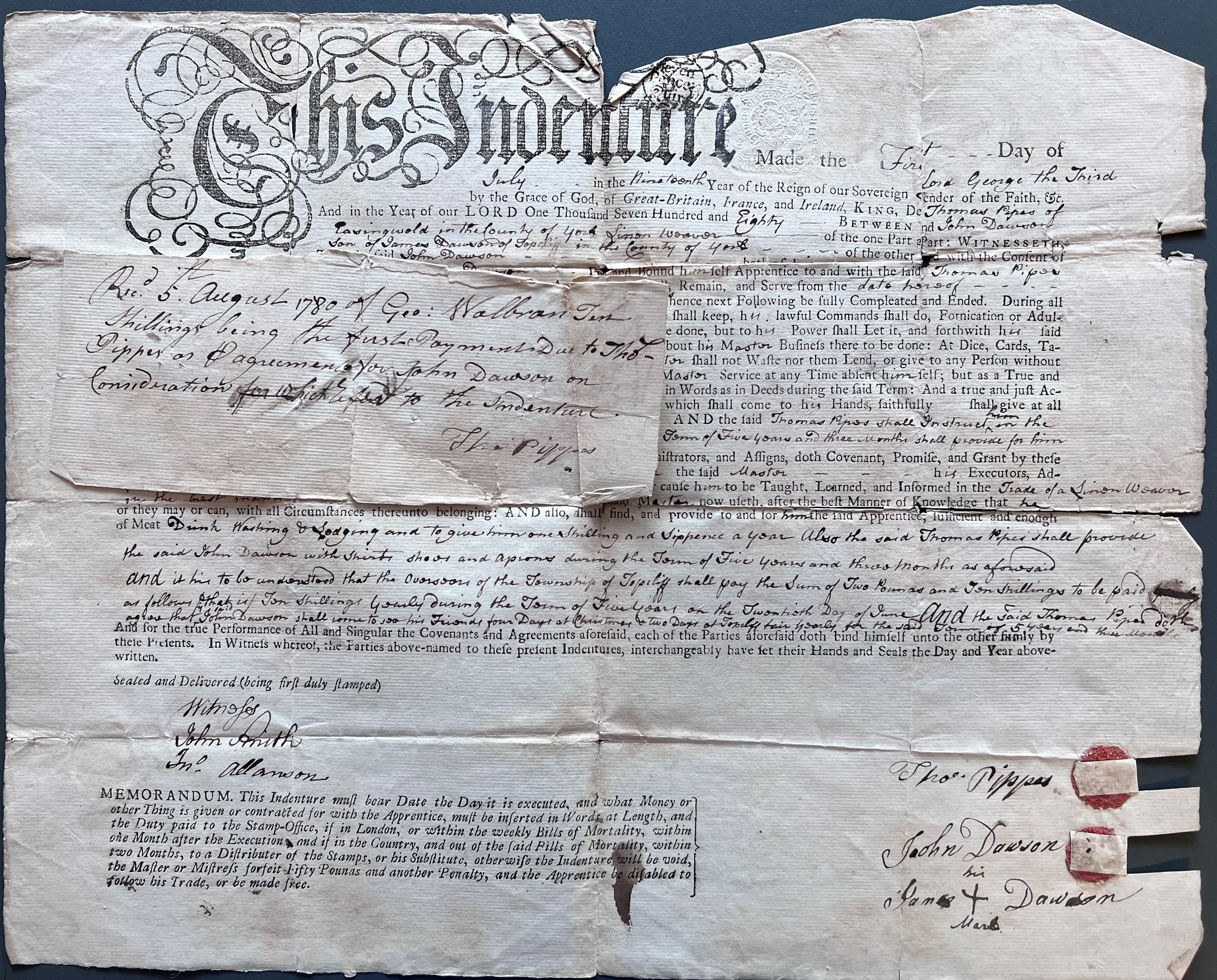 - PR/TOP 7/5/2 Apprenticeship indenture of John Dawson, 1 July 1780