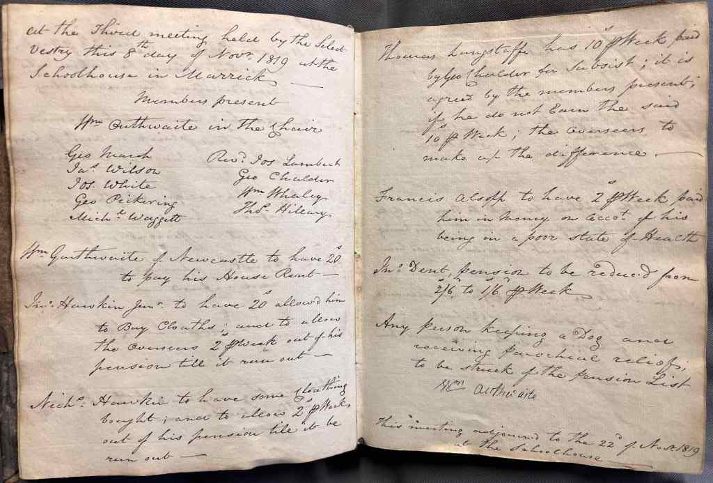 PC/MAR 1/1 , Minutes of 8 November 1819 recording that “Any person keeping a dog and receiving parochial relief to be struck of[f] the pension list”.