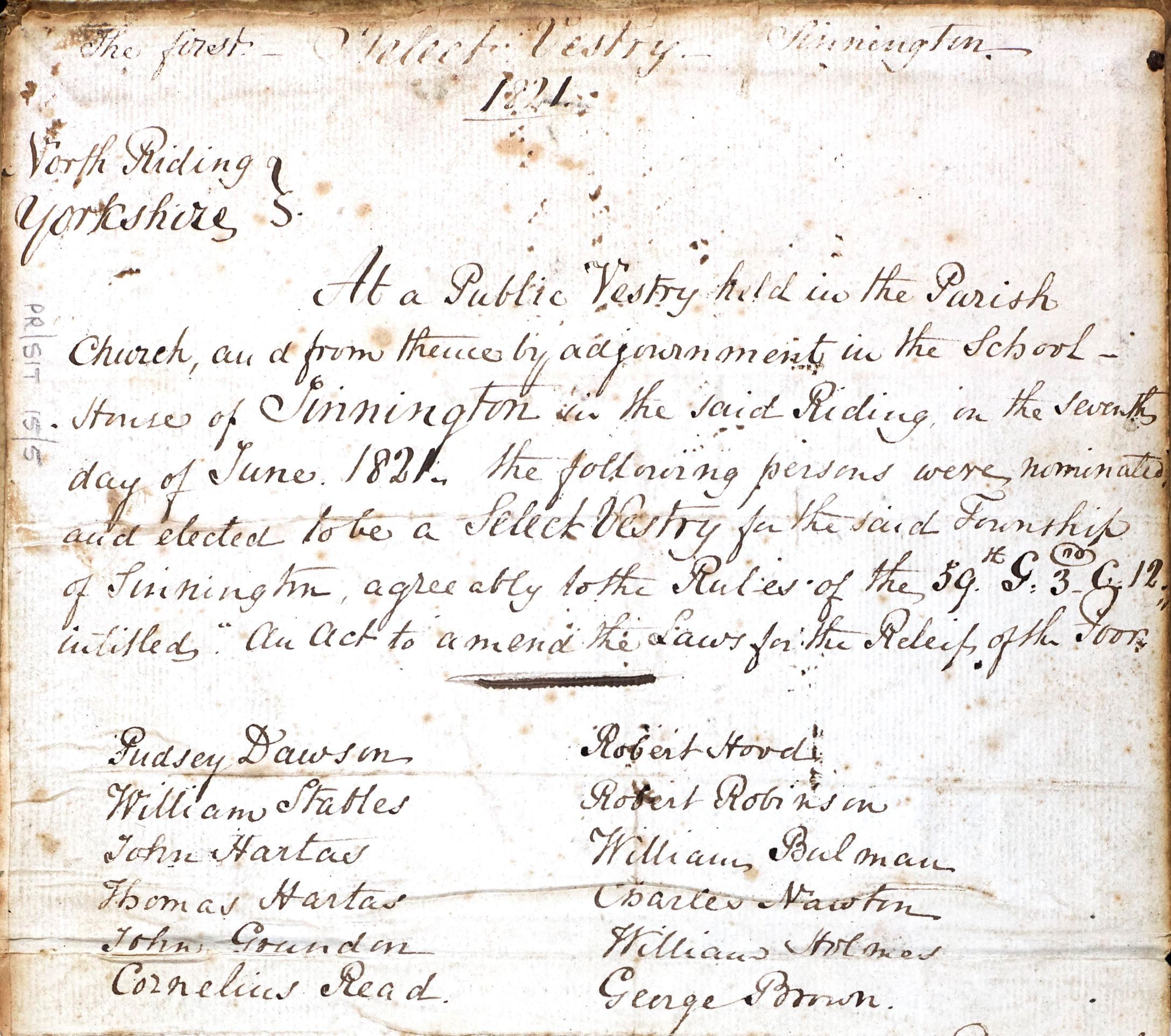 “At a Public Vestry held in the Parish Church, and from thence by adjournment in the School House of Sinnington in the said Riding on the seventh day of June 1821, the following persons were nominated and elected to be a Select Vestry for the said township of Sinnington agreeably to the Rules of the 59th G3 c.12 intitled “An Act to amend the Laws for the Relief of the Poor”